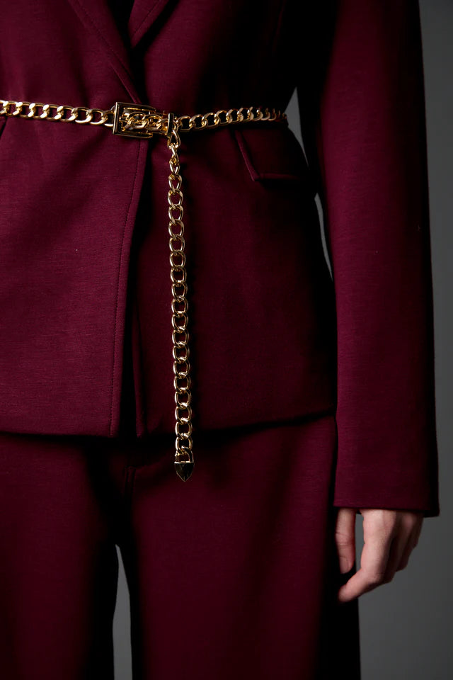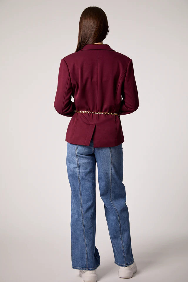 Elevate your wardrobe with the Blue Revival Taylor Blazer—a masterpiece of refined elegance. This sophisticated blazer features a removable gold chain belt that transforms your look with instant luxury. Wear it secured through the belt loops for a polished, intentional style, or remove it entirely for a sleek, minimalist aesthetic. The versatile design pairs seamlessly with the Taylor Trouser in Vampy for a complete, head-turning ensemble. Perfect for boardrooms, brunches, or evening events, this blazer delivers timeless sophistication with modern flair.