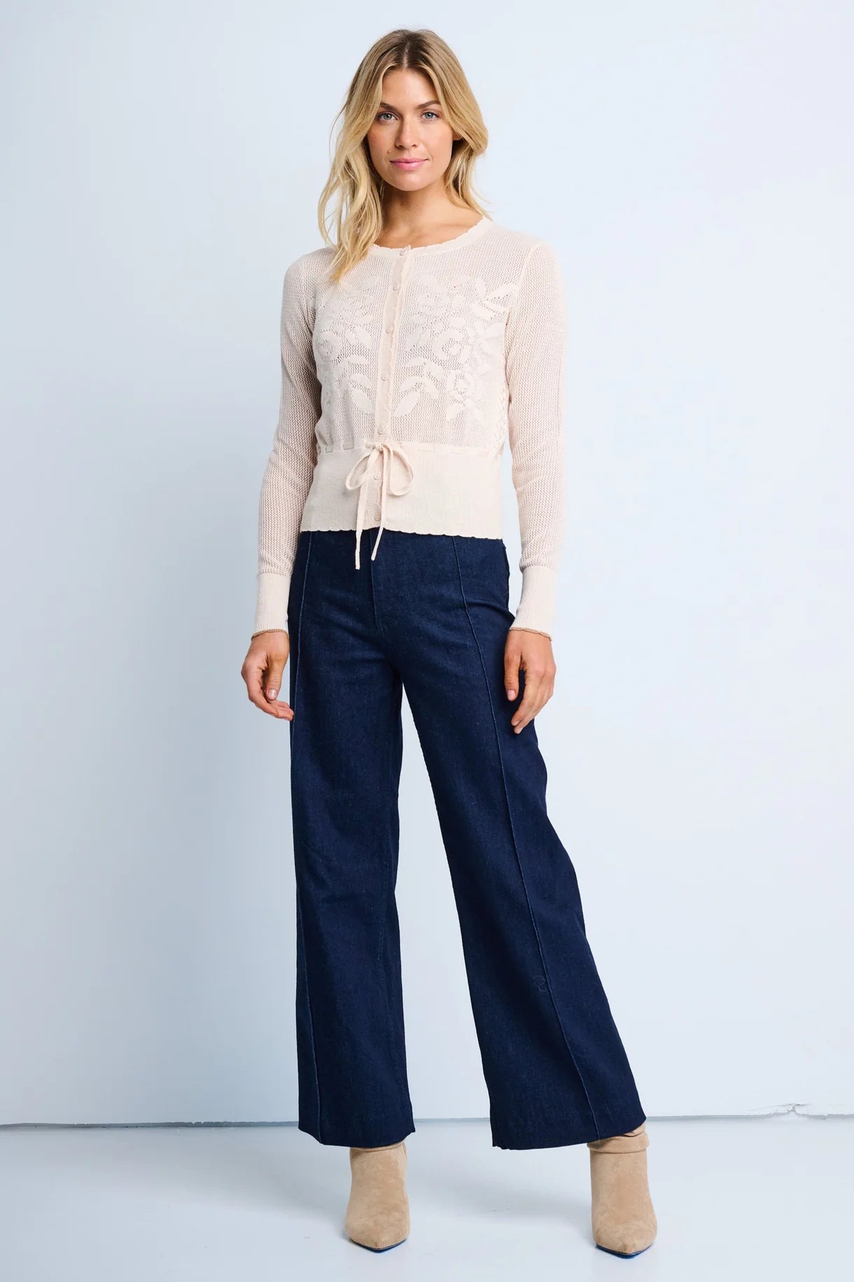 The Lisa Todd The Flirt Cardigan embodies femininity and elegance with its delicate scalloped edges and charming floral intarsia. Made from a luxurious cotton-cashmere blend, it offers softness and warmth in a slim fit silhouette. Featuring a seven-button closure and a self-tie waist, this cardigan gently defines your shape while contrast tipping at the cuffs adds a subtle touch of sophistication. Perfect for layering, its open-stitch texture enhances breathability without compromising style. Elevate your wardrobe with a versatile piece that combines comfort and refined detail effortlessly.