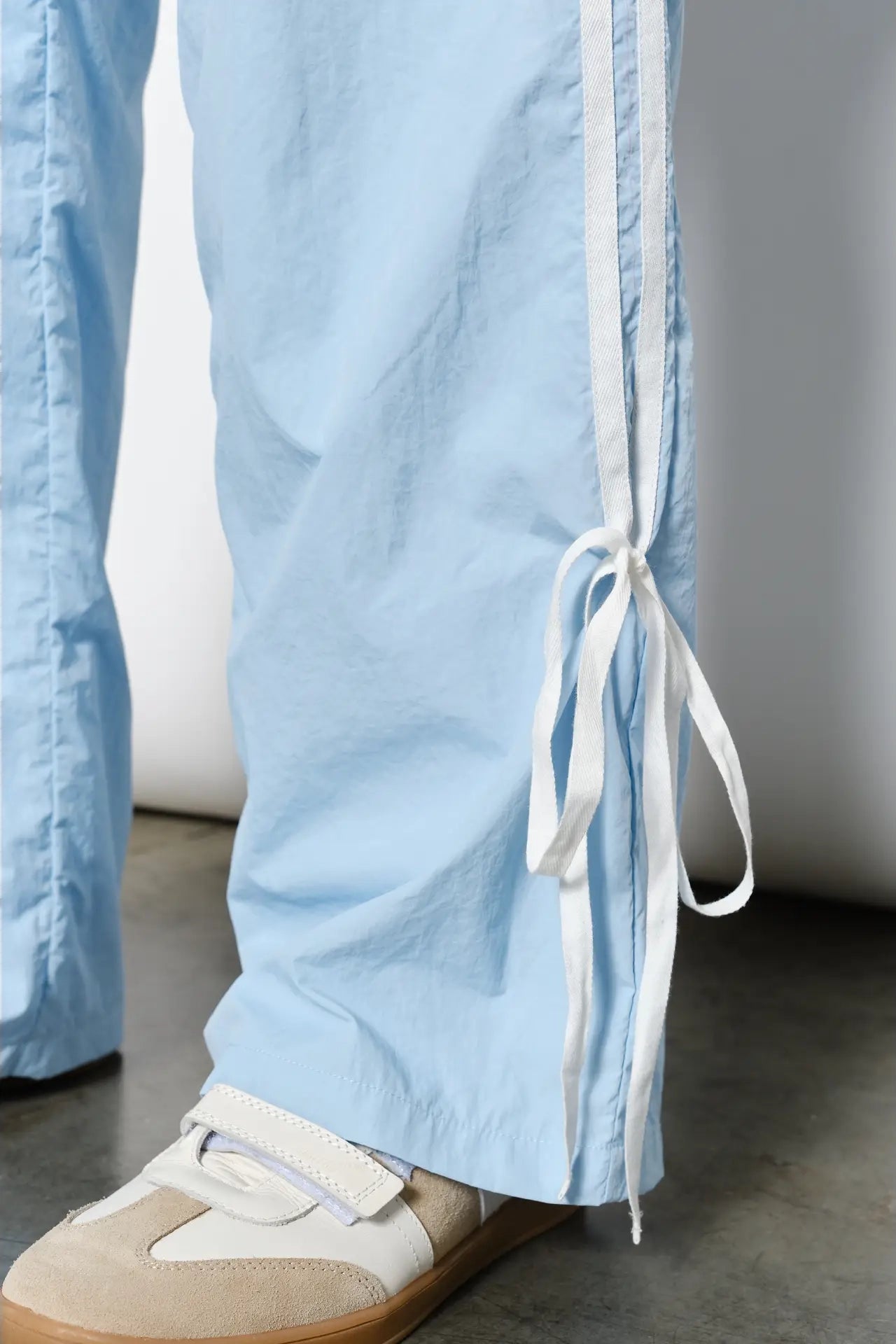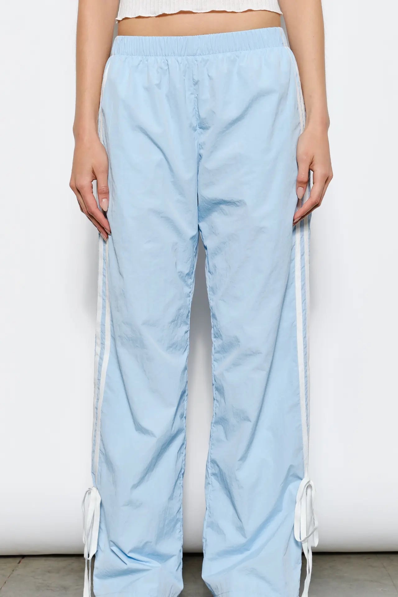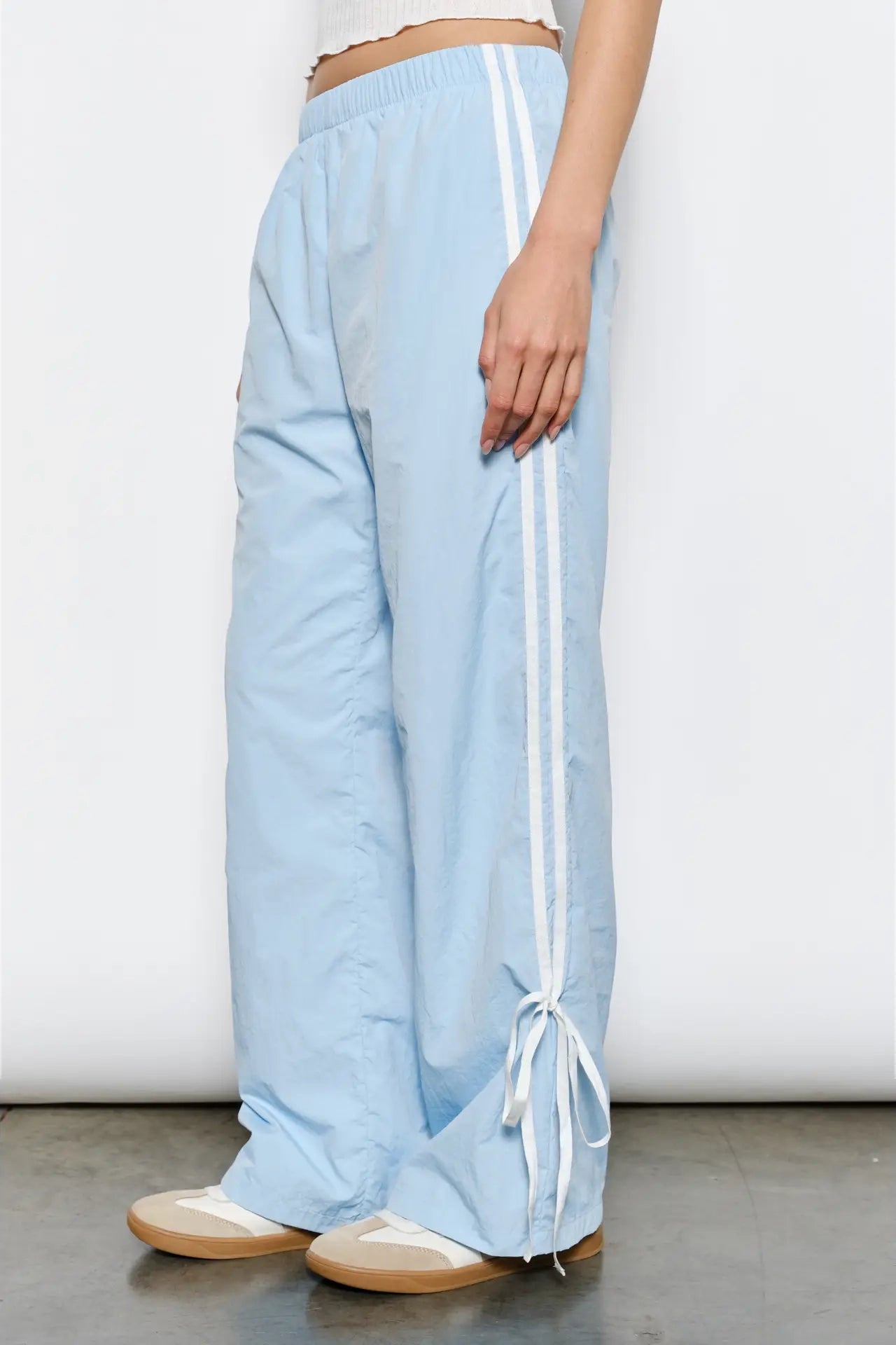 Experience comfort and style with the American Poet Dakota Bow Track Pants. Featuring an elasticized waistband and mid-rise fit, these pants offer a flattering and secure feel. Two convenient pockets and self ties at the sides add both function and a chic touch. Fully lined for smooth wear, they are perfect for casual outings or relaxed days at home. Elevate your wardrobe with these versatile track pants designed for effortless elegance.