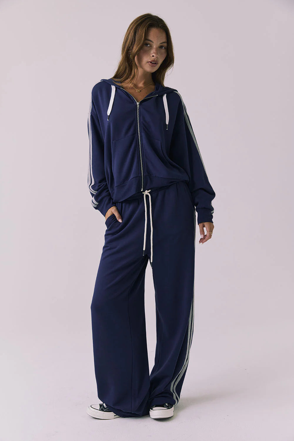 The Chaser Abilenee Zip Up Hoodie brings refined simplicity to everyday layering. Crisp white stripes trace the sleeves in a clean geometric pattern, elevating this piece beyond standard casual wear. Built for versatility, it layers effortlessly over basics for added dimension or pairs with matching tailored joggers for a curated, intentional look. A foundational wardrobe piece designed for thoughtful styling across seasons.
