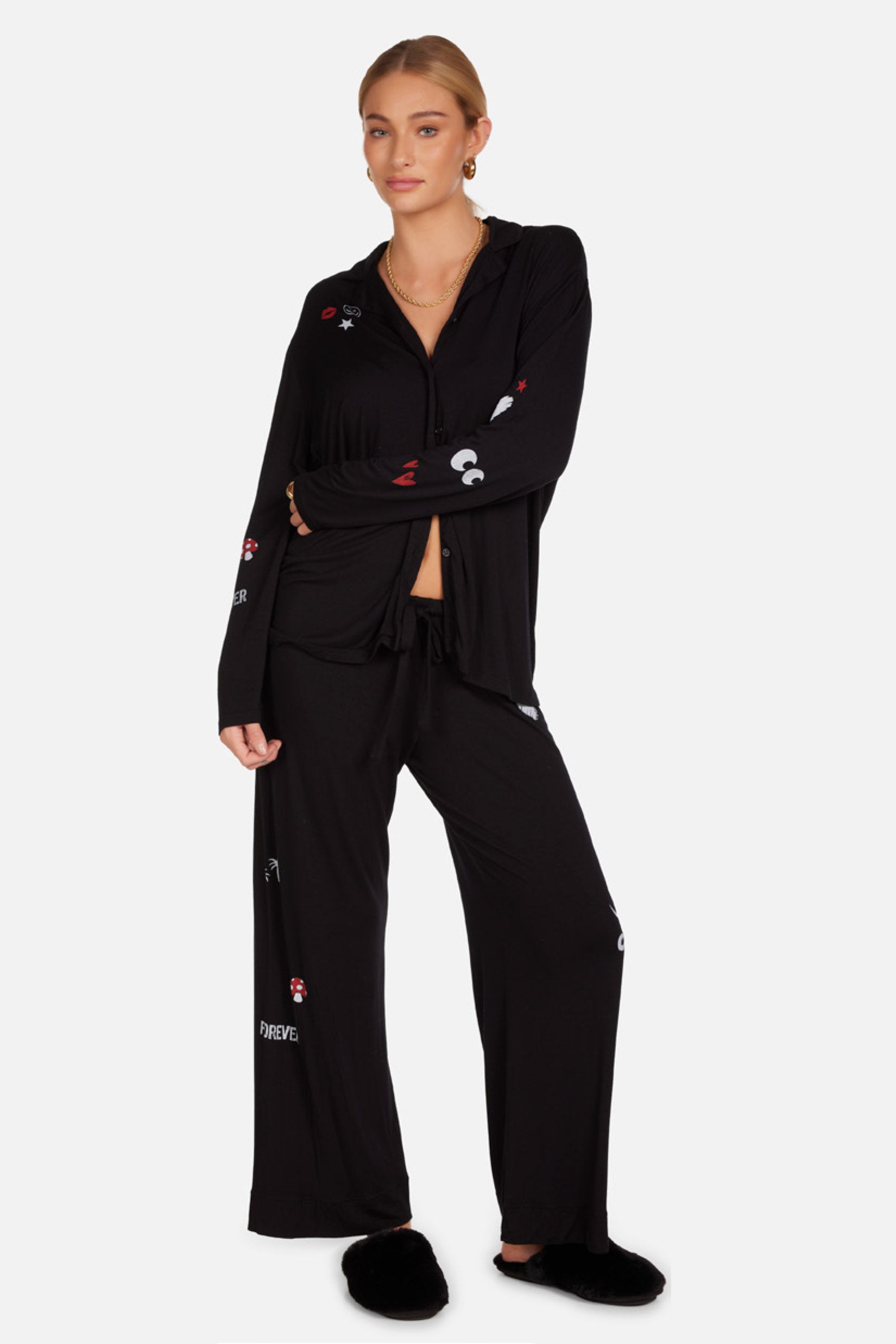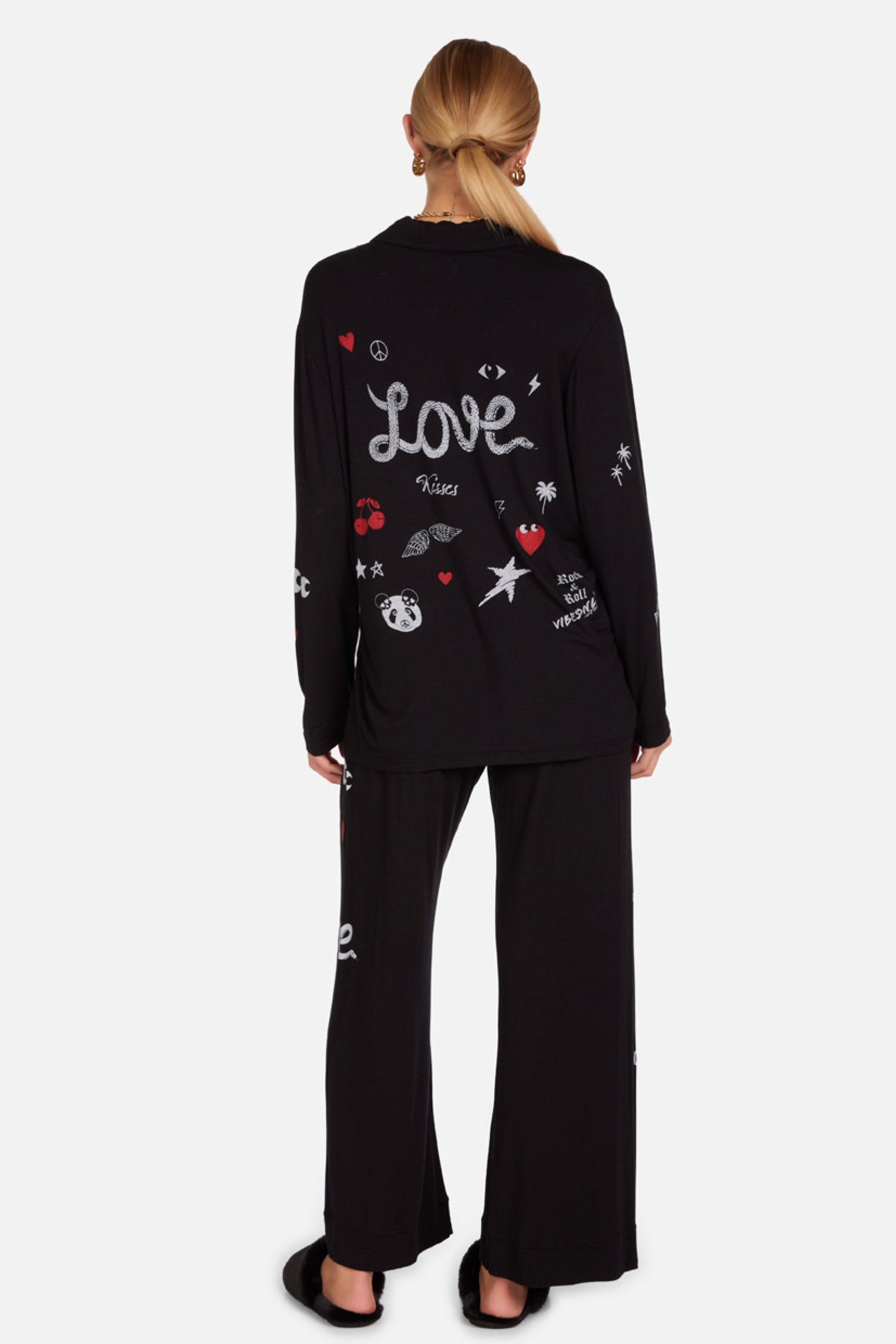 Slip into effortless comfort with the Lauren Moshi Alison Pajama Set. Crafted from a luxuriously soft jersey knit blend of modal, cotton, and spandex, this set features a relaxed wide-leg silhouette with an elastic drawstring waist and front button closure. Adorned with playful snake, love, and charm motifs throughout, it's the perfect balance of style and coziness. Machine wash cold and lay flat to dry for lasting softness.