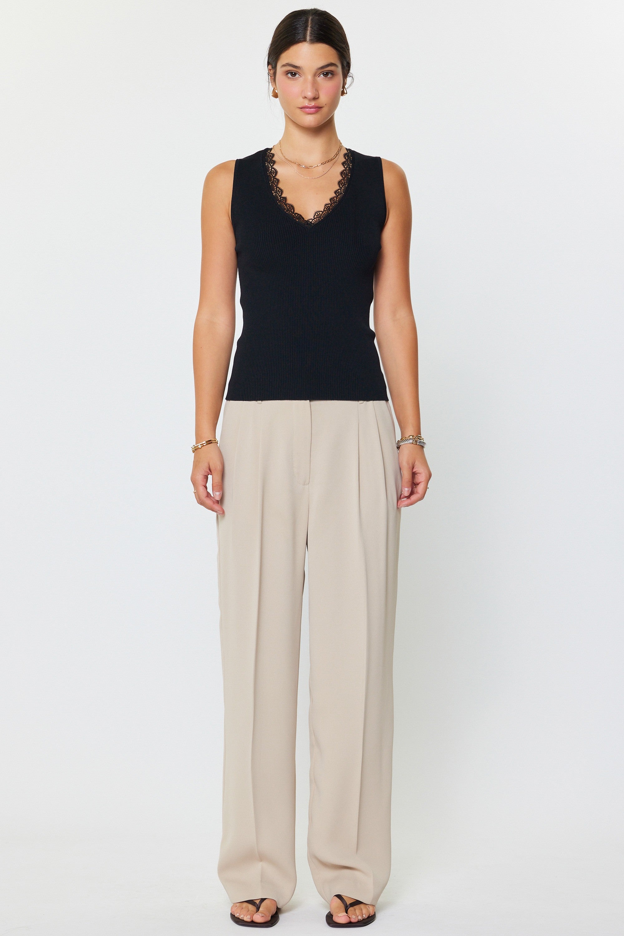 Discover the perfect bridge between casual comfort and refined elegance. This fitted sleeveless tank features intricate crochet lace trim that frames a flattering V-neckline, instantly elevating any look. The stretchy ribbed knit moves with your body, maintaining its shape through wear while providing all-day comfort. Layer it under sheer tops for dimension, pair it with your favorite denim for effortless style, or wear it solo for a sophisticated edge. A versatile essential that works as hard as you do, from morning meetings to evening plans.