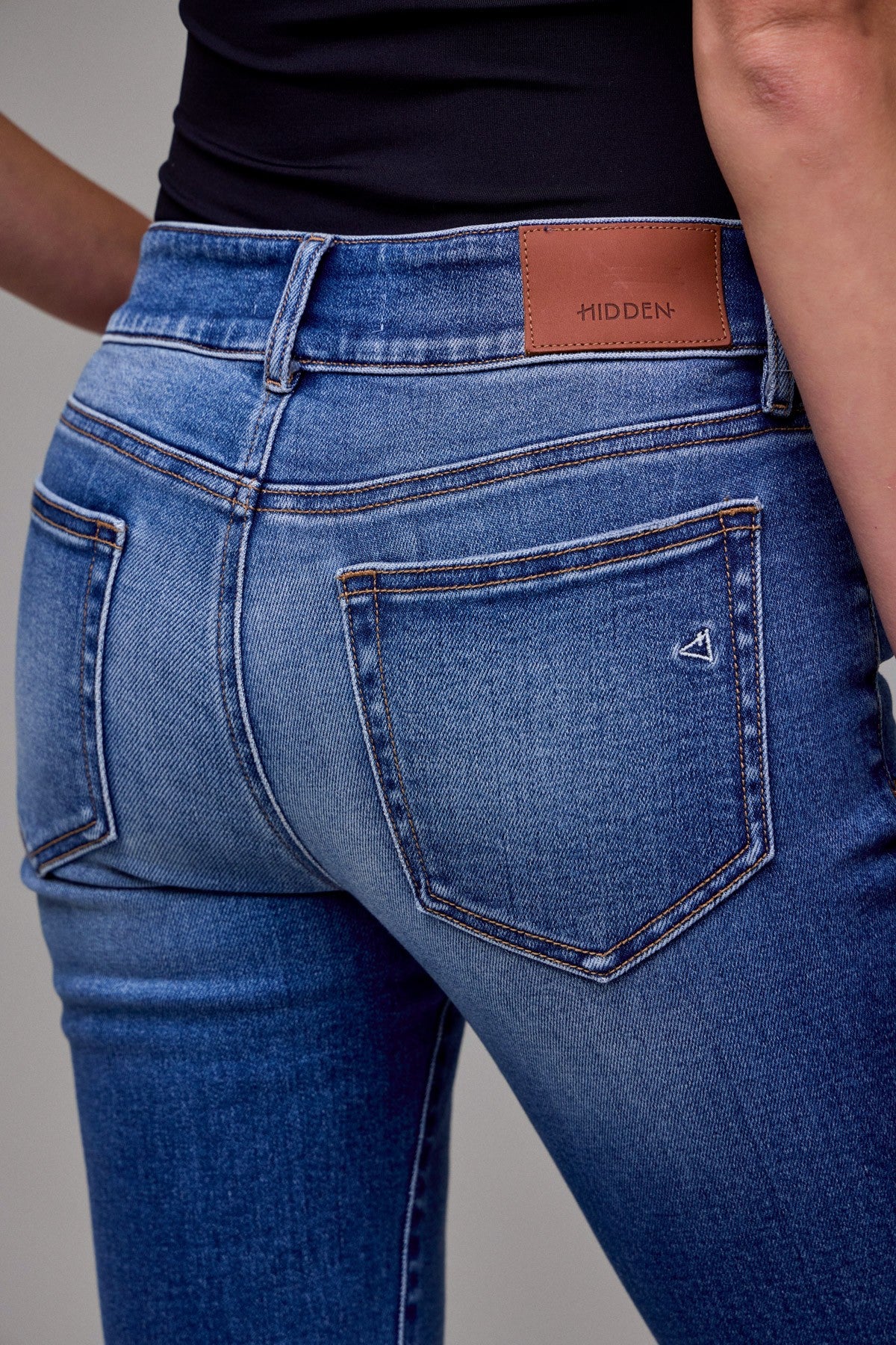 These Hidden Ryan Low Rise Jeans offer a perfect blend of style and comfort with their medium wash stretch fabric. Designed with a flattering low-rise fit and bootcut silhouette, they enhance your shape while allowing easy movement. Ideal for everyday wear, these jeans bring together classic appeal and modern flexibility for a versatile addition to your wardrobe.