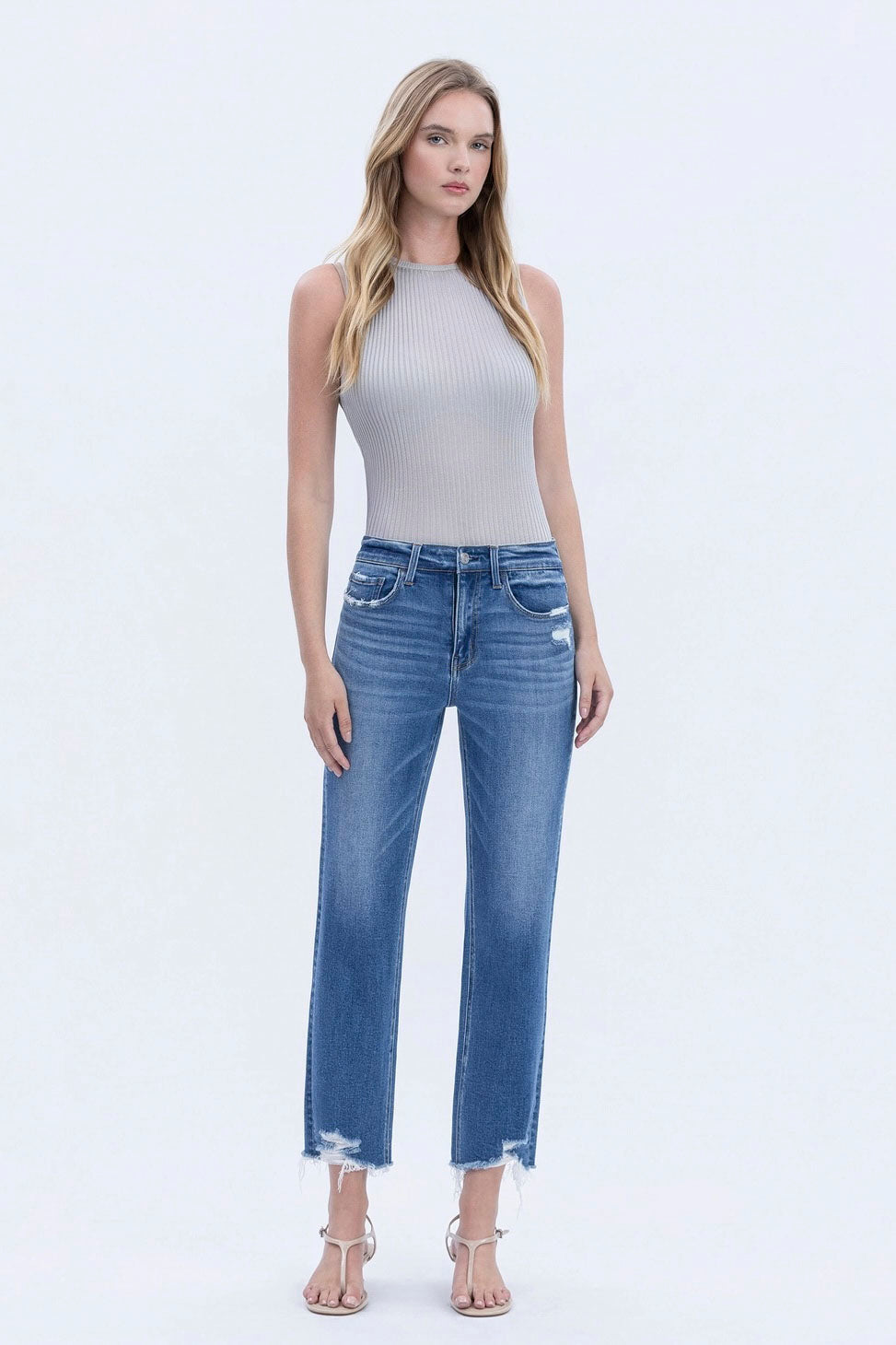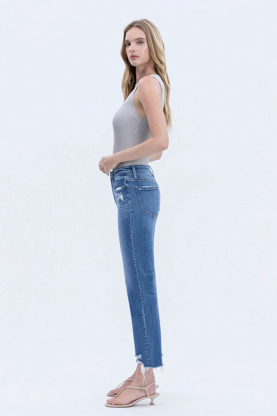 Experience effortless style with the Vervet Lovervet Cropped Straight Leg Jeans. Crafted from comfort stretch denim, these jeans provide a flattering high-rise fit that shapes your waist. Distressed details and a frayed hem add a trendy, lived-in vibe, while the cropped length and straight leg silhouette make them perfect for showcasing your favorite footwear. Elevate your everyday look with these versatile, on-trend jeans designed for both comfort and confidence.