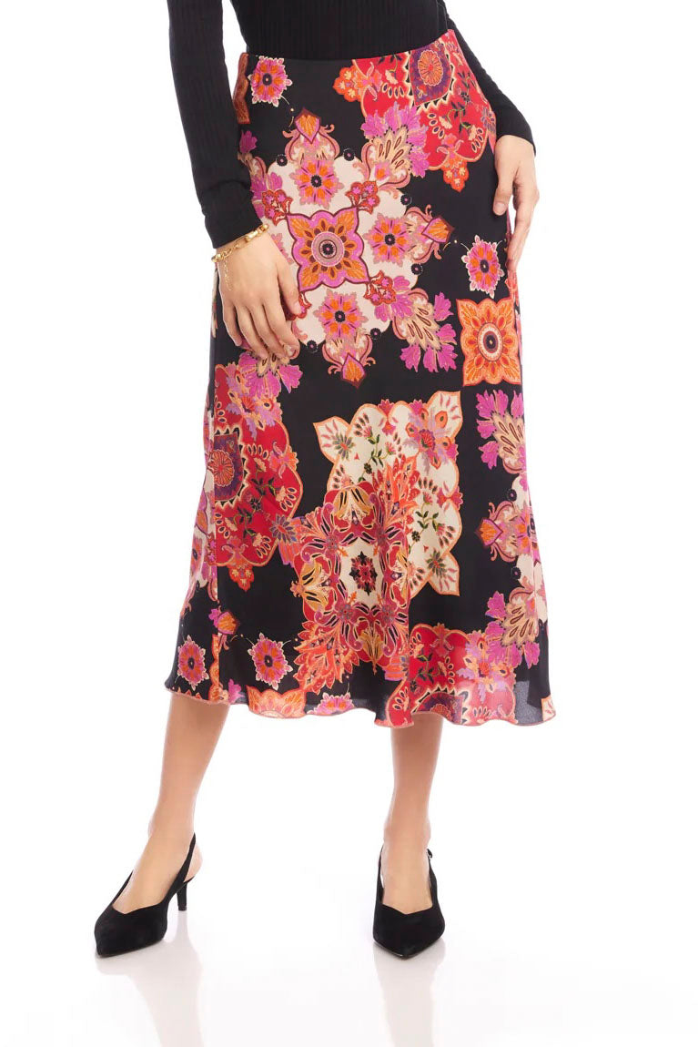 This Karen Kane Bias Cut Midi Skirt features a vibrant medallion floral print on lightweight crepe that moves gracefully with every step. Designed to skim the body from a smooth waistline through the hips, its slim fit transitions into a soft, flared hem for a flattering and feminine silhouette. Perfect for adding effortless elegance and vibrant style to any wardrobe.