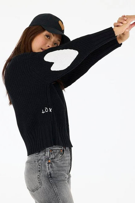 Embrace classic fisherman-inspired style with the Kerri Rosenthal Marlow Imperfect Heart Sweater. Crafted from soft 100% cotton, this rib-knit mock-neck sweater offers a relaxed fit with dropped shoulders for effortless comfort. Eye-catching heart appliqué elbow patches add a unique, playful touch, while the subtle "loved" embroidery at the waistline makes it truly special. Perfect for layering, this sweater blends timeless design with cozy wearability.