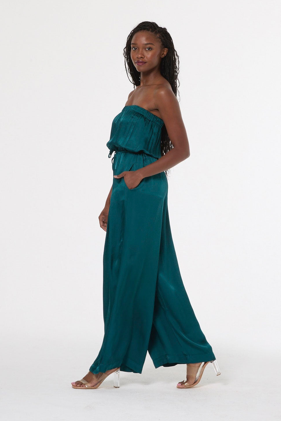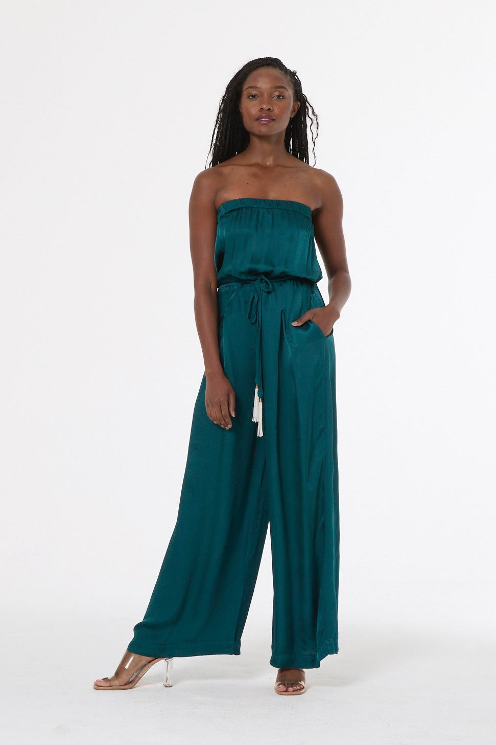 Make a statement in the YFB Bonita Jumpsuit, where effortless elegance meets modern edge. This wide-leg jumpsuit features a sleek tube top and luxurious satiny fabric that drapes beautifully with every move. The standout tassel tie waist cinches your silhouette while adding playful dimension. In a stunning teal hue, this piece transitions seamlessly from day to night, giving you the confidence to turn heads at any occasion. Versatile, flattering, and undeniably chic.