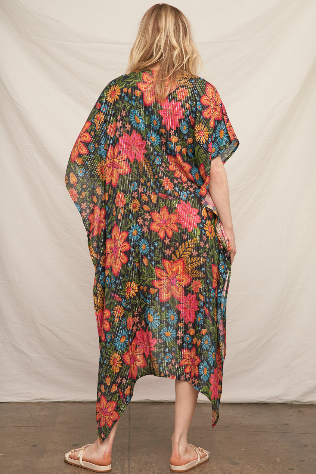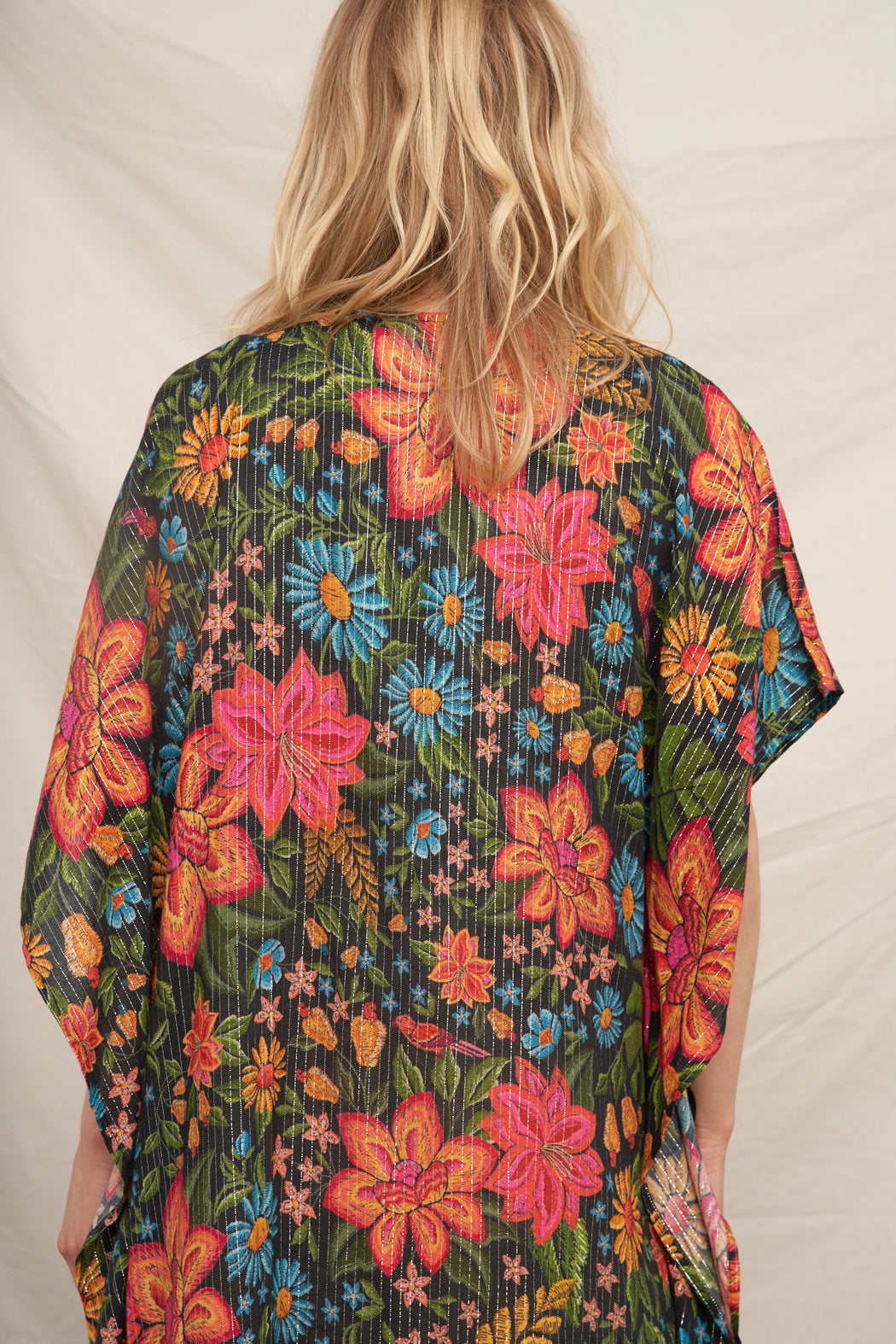 # 61 Jane Short Sleeve Kimono Elevate your wardrobe with this stunning short-sleeve kimono, featuring an eye-catching floral print accented with shimmering lurex stripes. The relaxed, flowing silhouette offers effortless sophistication—perfect for layering over basics or wearing as a statement piece. Soft, breathable fabric moves with you throughout the day, while the intricate design details add a touch of luxury to any outfit. Whether you're dressing up for an occasion or keeping it casual, this versatile kimono transitions seamlessly from day to night. A timeless addition that instantly transforms your look.