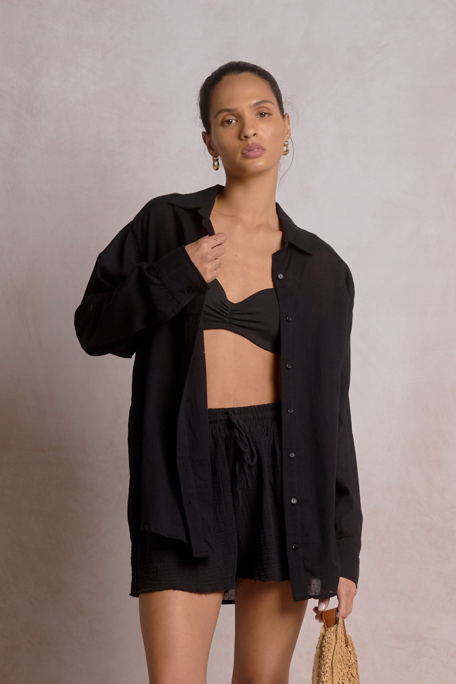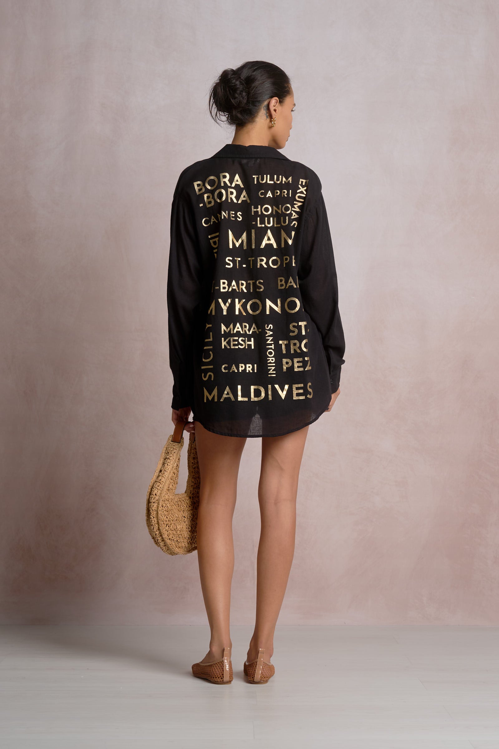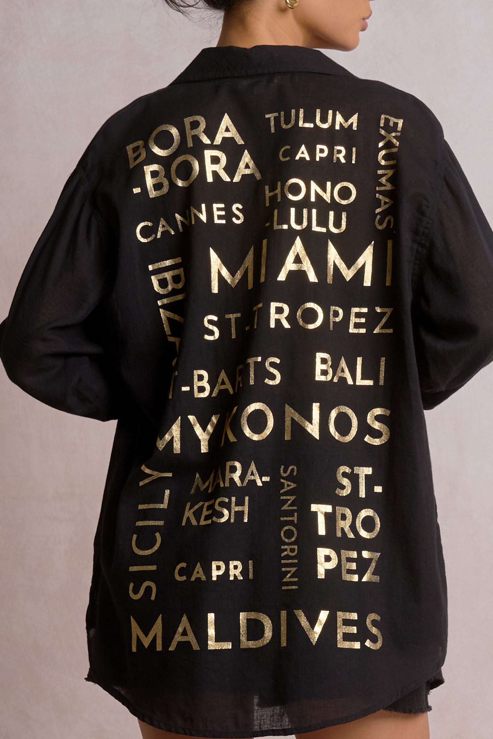 The Elan Vista Destination Button Down brings wanderlust-inspired style to your everyday rotation. Featuring striking destination graphics on the back, this button-down top effortlessly blends casual comfort with editorial flair. Perfect for layering or wearing solo, Vista captures that coveted vacation mindset while maintaining the polished aesthetic Lonnys NY is known for. Ideal for customers seeking pieces that tell a story and spark conversation.