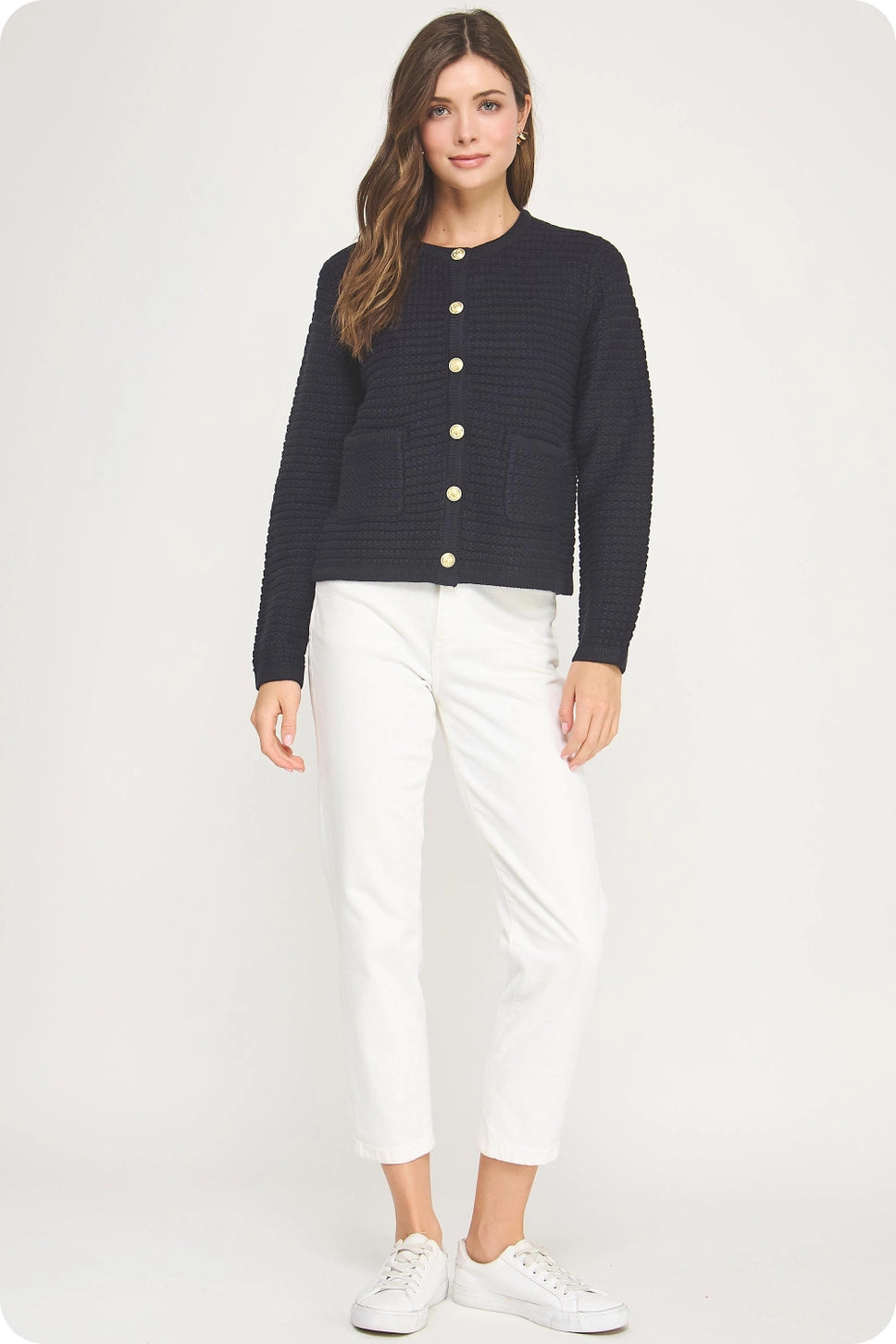 Elevate your everyday wardrobe with the 61 Jane Textured Cardigan Jacket—a sophisticated layering essential that effortlessly transitions from office to weekend. Crafted in luxurious textured knit, this versatile piece features a polished gold button closure, practical front pockets, and a flattering round neckline. Long sleeves provide warmth and coverage, while the refined silhouette works beautifully over dresses, tees, or worn open as a statement layer. Perfect for creating countless outfit combinations with timeless style.