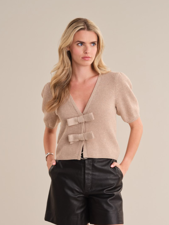 Introducing Elaine: the must-have addition to your wardrobe. This feminine cardigan features a V-neck, short puff sleeves, and rib trim for added style. The bow ties on the front add a touch of femininity, making it the perfect combination of fashion and comfort with its relaxed fit.