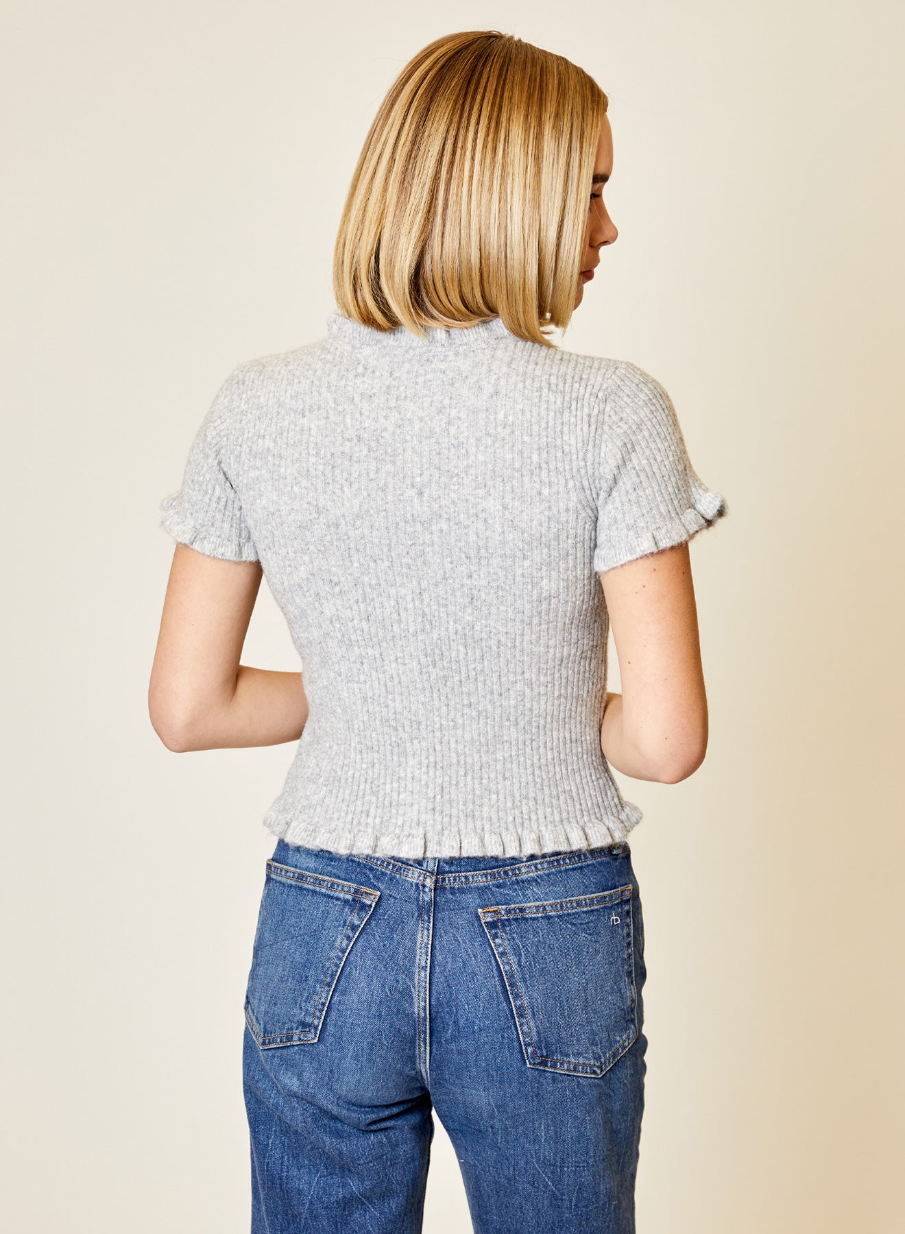 Elevate your wardrobe with the Design History Ruffle Trim Sweater. Featuring a flattering ribbed texture throughout and delicate ruffle trim, this sweater adds a touch of femininity to any outfit. The faux front button-down closure offers the look of classic style without the hassle, while the short sleeves make it perfect for layering or wearing on its own. Stylish and comfortable, this piece is ideal for adding effortless charm to your everyday look.