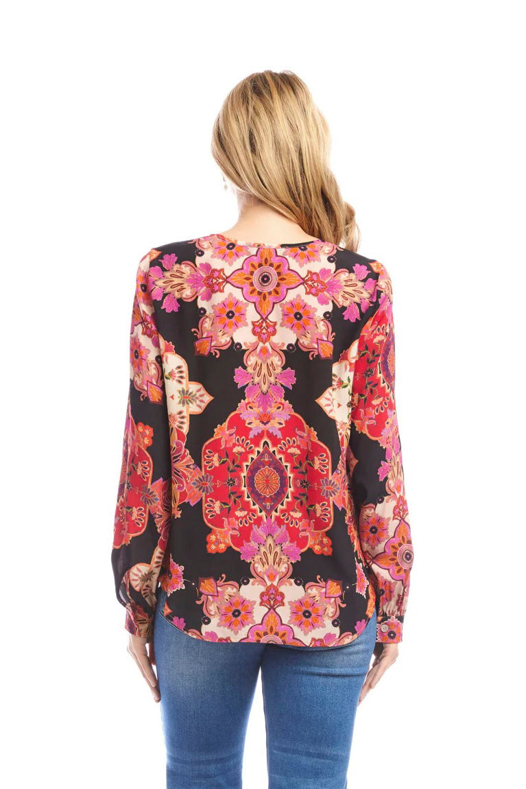 Elevate your wardrobe with the Karen Kane Long Sleeve Shirred Blouse, designed to combine comfort and style. Its flattering U-neckline and bold medallion floral print create an eye-catching look, while the relaxed fit and curved hem ensure effortless movement and a polished finish. Perfectly versatile, this blouse pairs seamlessly with jeans or skirts for a chic, relaxed outfit that keeps you confident all day.