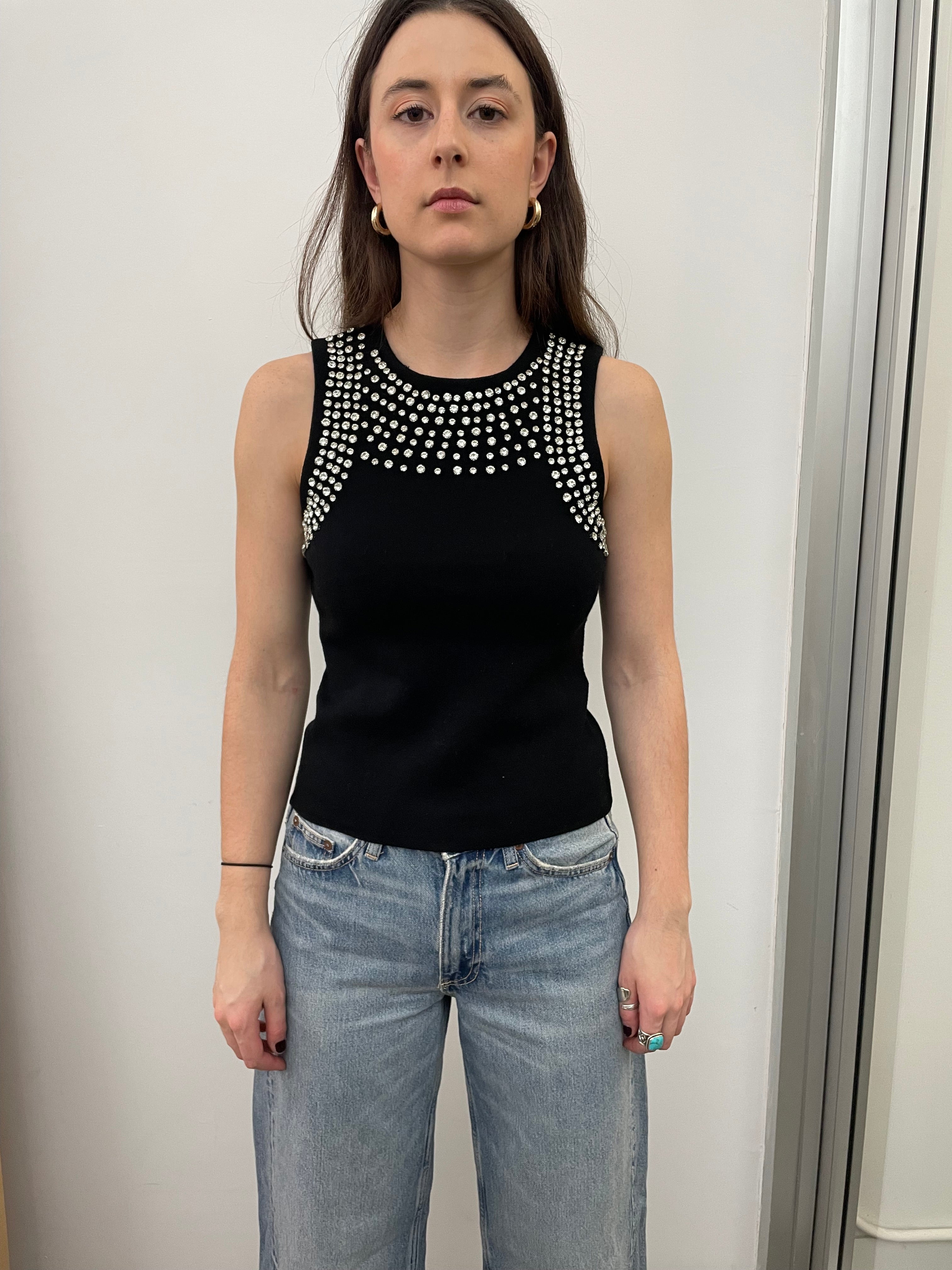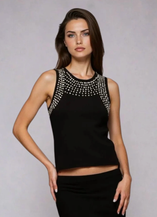 Elevate your everyday style with this stunning rhinestone-embellished tank top. Featuring a classic crew neck silhouette with eye-catching rhinestone detailing along the neckline and arms, this sleeveless piece adds instant sparkle to any outfit. Perfect for layering or wearing solo, the shimmering accents catch the light beautifully, making it an ideal choice for both casual days and special occasions. Versatile, chic, and undeniably glamorous.