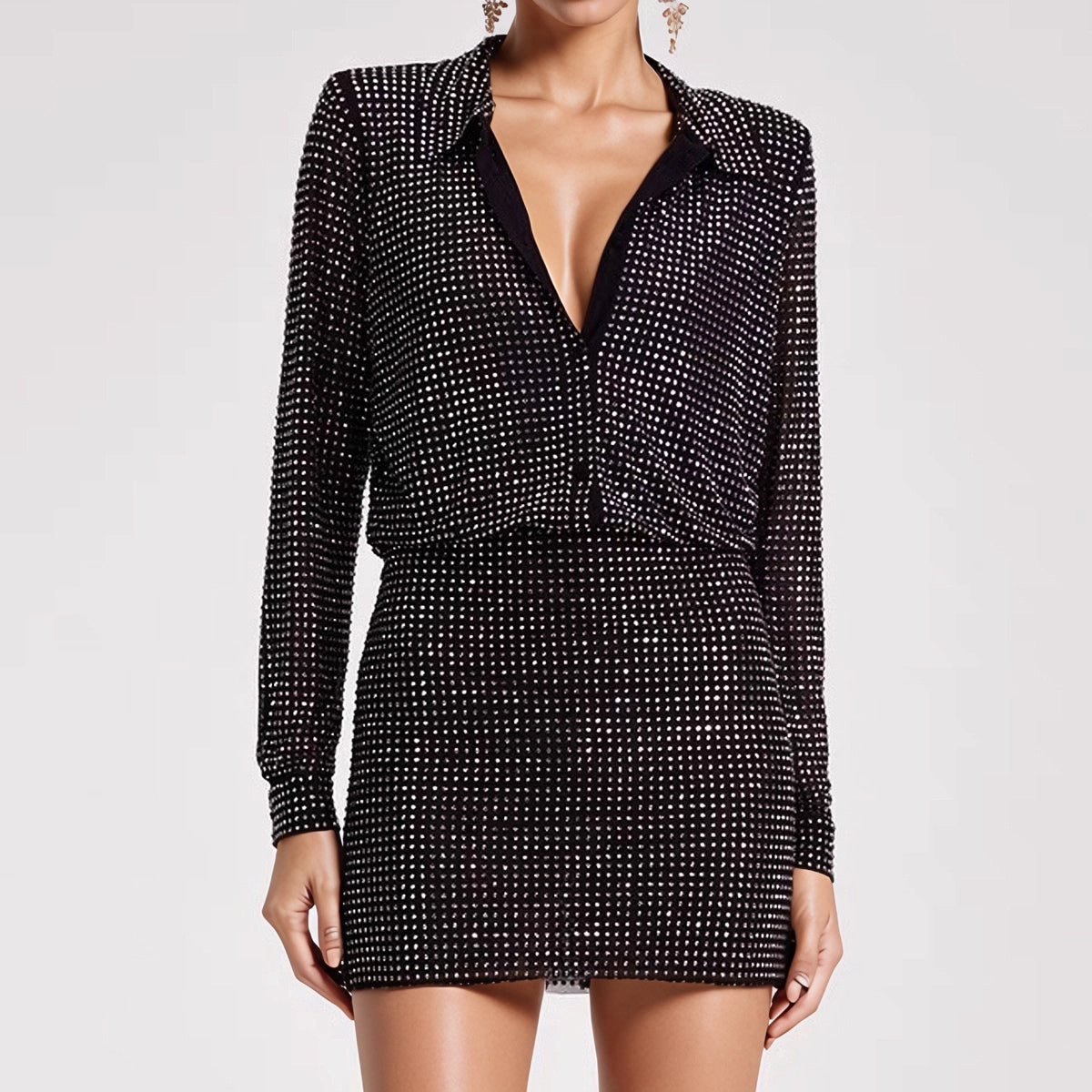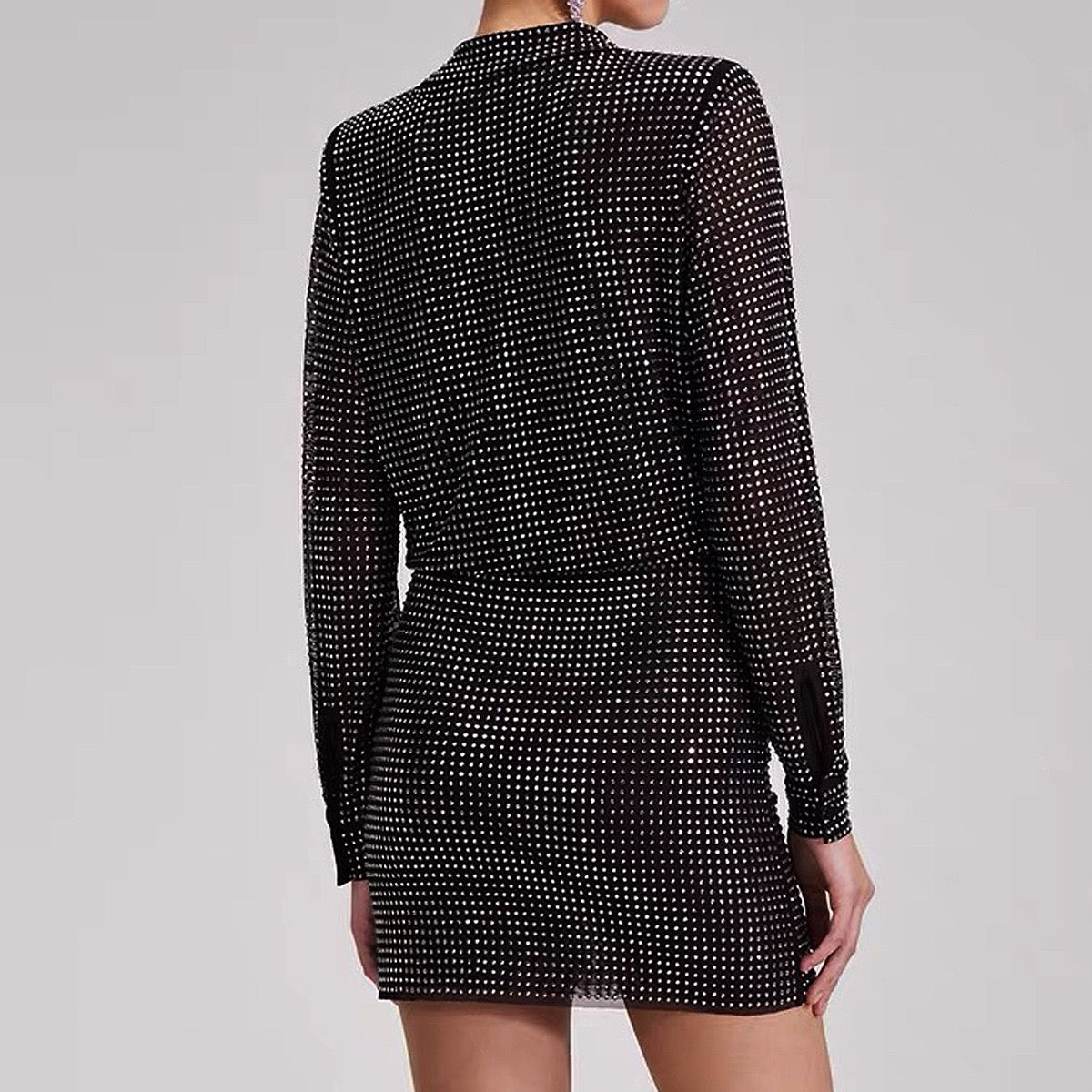 Elevate your style with this stunning mesh diamond shirt and skirt set that seamlessly transitions from day to night. The luxurious mesh shirt features a flattering deep V-neckline and long sleeves, while intricate diamond embellishments create an eye-catching sparkle that commands attention. The form-fitting skirt complements the top perfectly, accentuating your silhouette with refined comfort. Whether you're heading to brunch or an evening soirée, this versatile ensemble delivers modern elegance with an undeniable touch of glamour. A wardrobe essential that proves sophistication and everyday wearability can coexist beautifully.