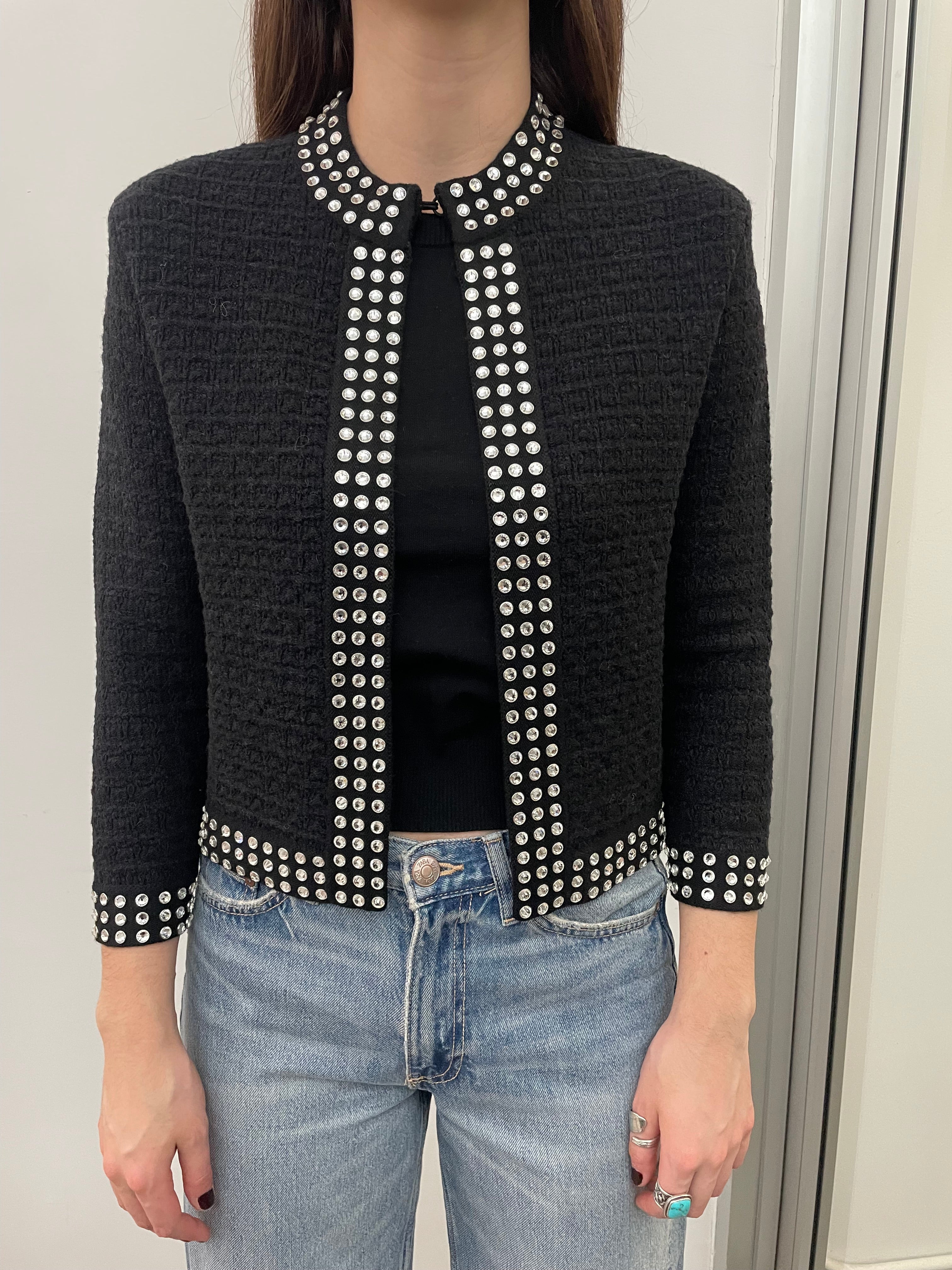 Elevate your wardrobe with this stunning Minnie Rose jacket, where timeless style meets eye-catching glamour. The three-quarter sleeves offer the perfect balance of coverage and sophistication, while intricate rhinestone trim adorns the neckline, center front, and cuffs for a touch of sparkle that catches the light beautifully. Whether you're dressing up for a special occasion or adding polish to everyday wear, this versatile piece transforms any outfit into something truly memorable. The luxurious embellishments make it an instant statement maker that celebrates your unique sense of style.