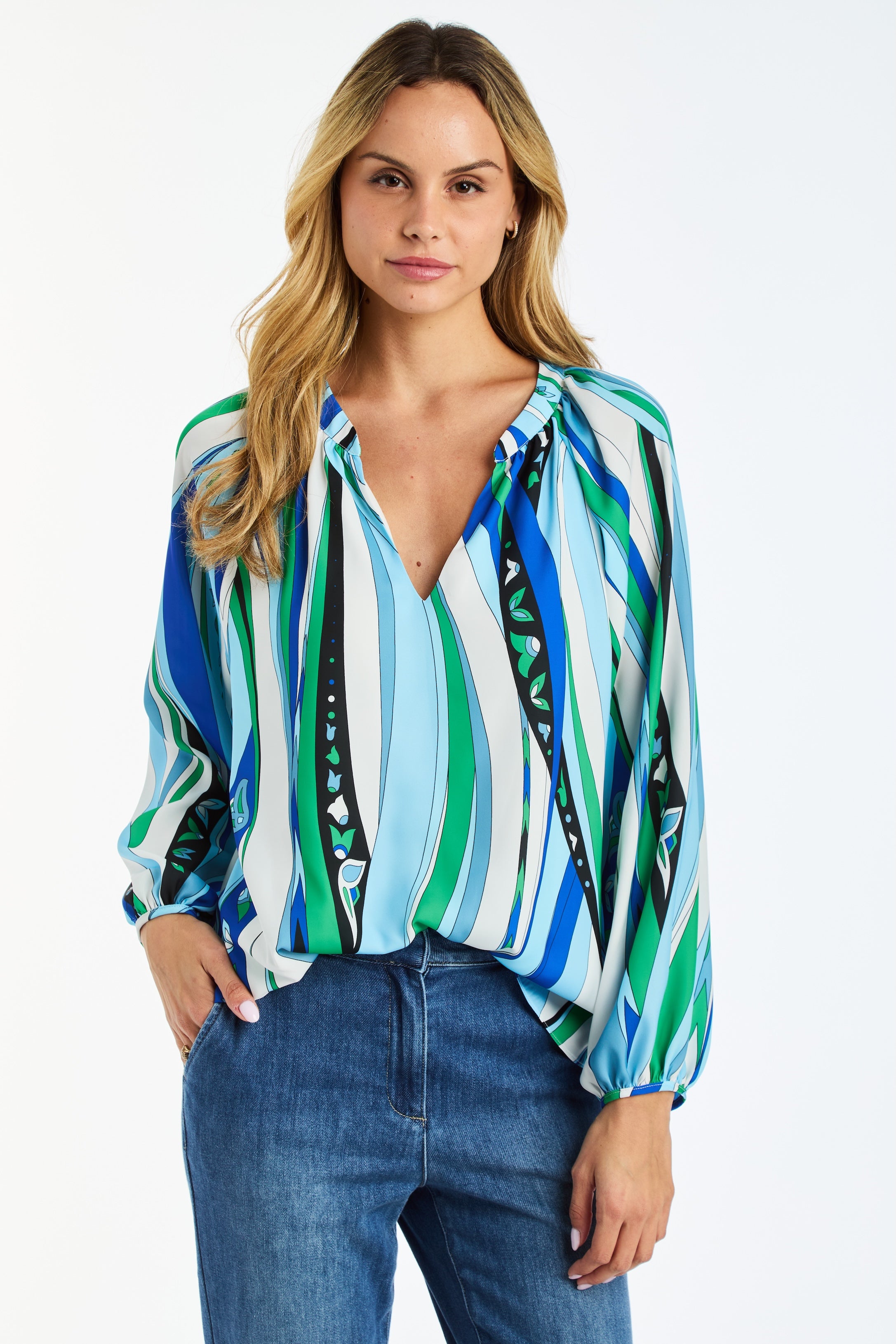 The Drew Wisty Shirt features a romantic puff sleeve design paired with a flattering split V-neckline. Crafted in a vibrant multicolor palette, this blouse effortlessly transitions from office to weekend wear. The voluminous sleeves add movement and dimension, while the neckline detail creates a refined, editorial silhouette. Perfect for layering or wearing solo, this piece brings color and personality to any wardrobe.