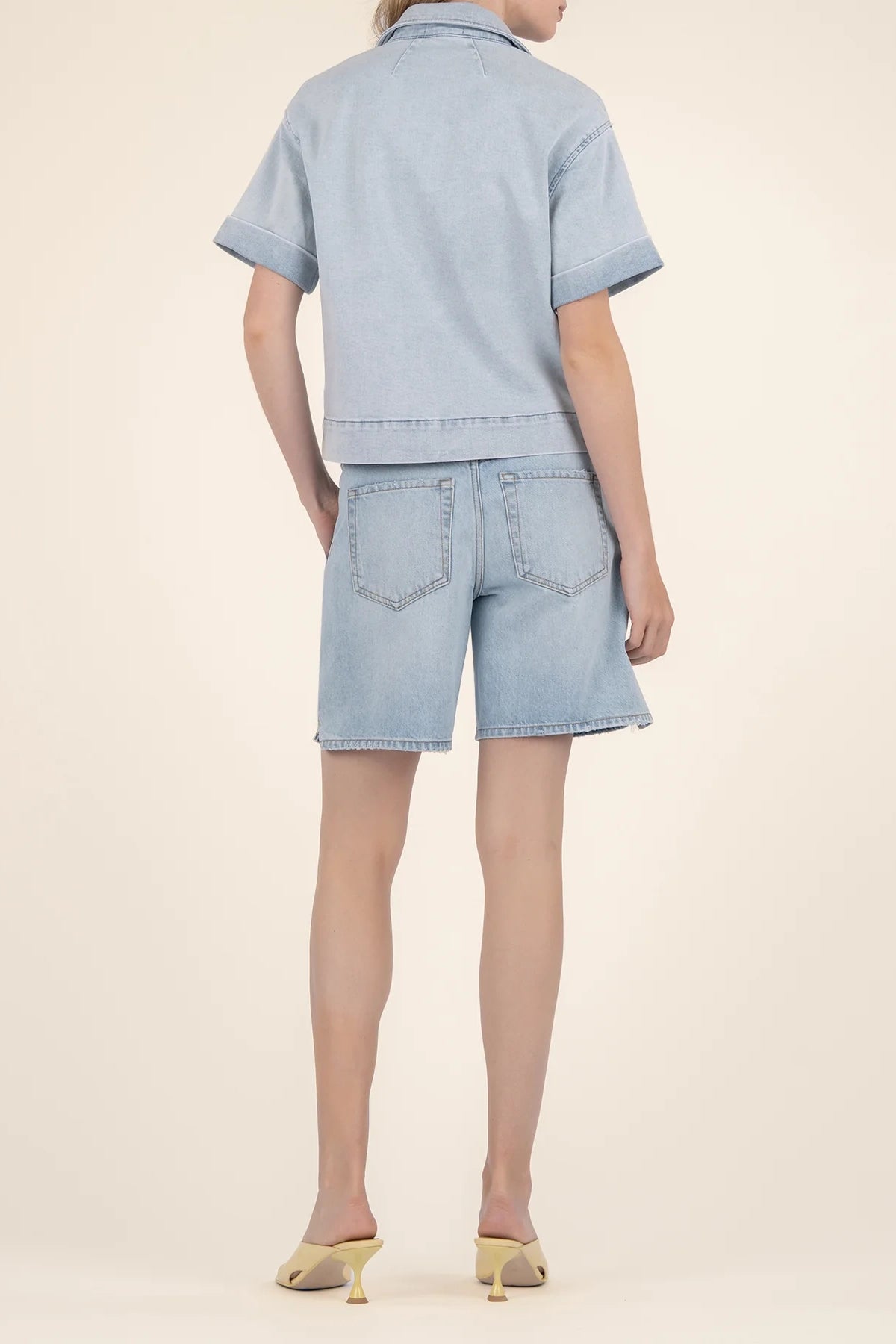 The Kut Kiko Boxy Camp Shirt in light wash denim offers a fresh take on casual style. Its relaxed fit, short sleeves, and button-front design make it effortlessly cool, while front pockets add practical detail. This shirt is perfect for those seeking a comfortable yet distinctive piece to elevate everyday outfits with a touch of individuality.