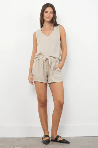Experience effortless comfort with the LA Made Lyric Shorts, featuring a convenient drawstring waist for a perfect fit and soft, lightweight fabric that moves with you. Practical side pockets keep your essentials within reach, blending style and function seamlessly. Pair them with the matching Helena V-Neck Tank for a relaxed yet polished look that’s perfect for any casual occasion.
