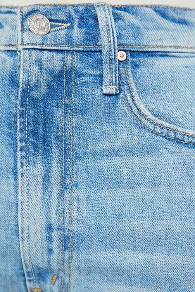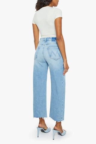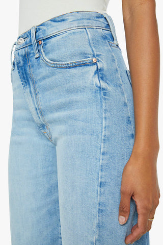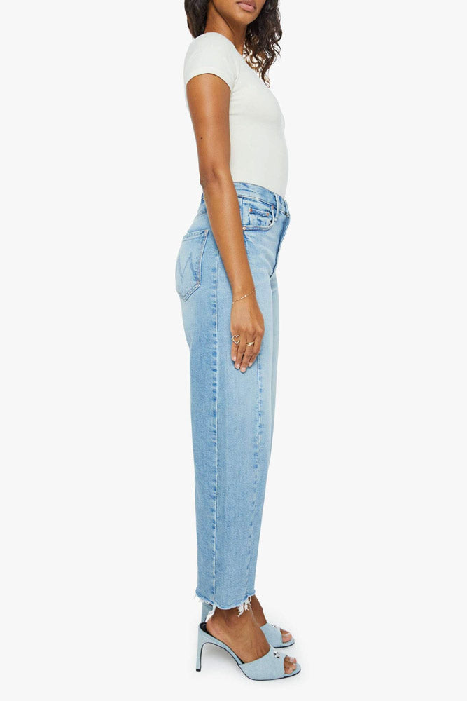 Elevate your denim collection with our Mother Half Pipe Ankle Fray Jeans. These super high-waisted beauties feature a distinctive wide, curved leg and frayed ankle hem that commands attention. Crafted from premium semi-rigid SUPERIOR denim in light blue with authentic whiskering and knee fading, they'll mold to your unique shape over time. The perfect statement piece that transitions effortlessly from casual outings to styled-up evenings.
