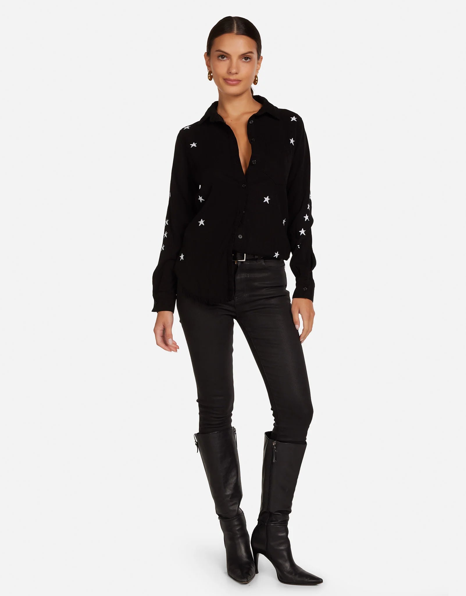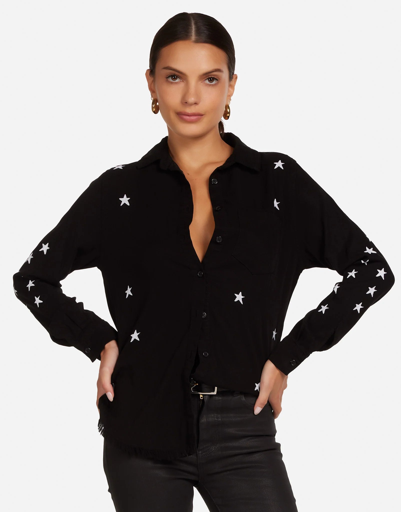 Experience effortless cool with the Lauren Moshi Sloane Only Rock N Roll Button Down Shirt. Crafted from ultra-soft woven fabric, it offers unmatched comfort and style. Featuring a raw edge frayed hem and iconic "Only Rock and Roll" screen print on the back, this shirt makes a bold statement. The front button closure, stud appliqués, star graphics, and left chest pocket add unique rock-inspired details that elevate any look. Perfect for those who want to combine edge and ease in one striking piece.