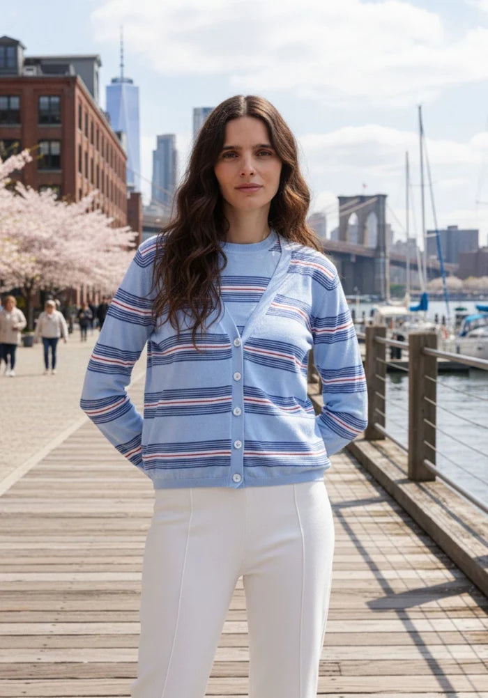 Minnie Rose's signature blend of lightweight cotton and cashmere creates a cardigan that feels as luxurious as it looks. Delicate stripes run throughout, while the refined V neckline flatters every frame. Layer it over the coordinating striped shell or short sleeve crew for a polished, put-together aesthetic that transitions seamlessly from day to evening.