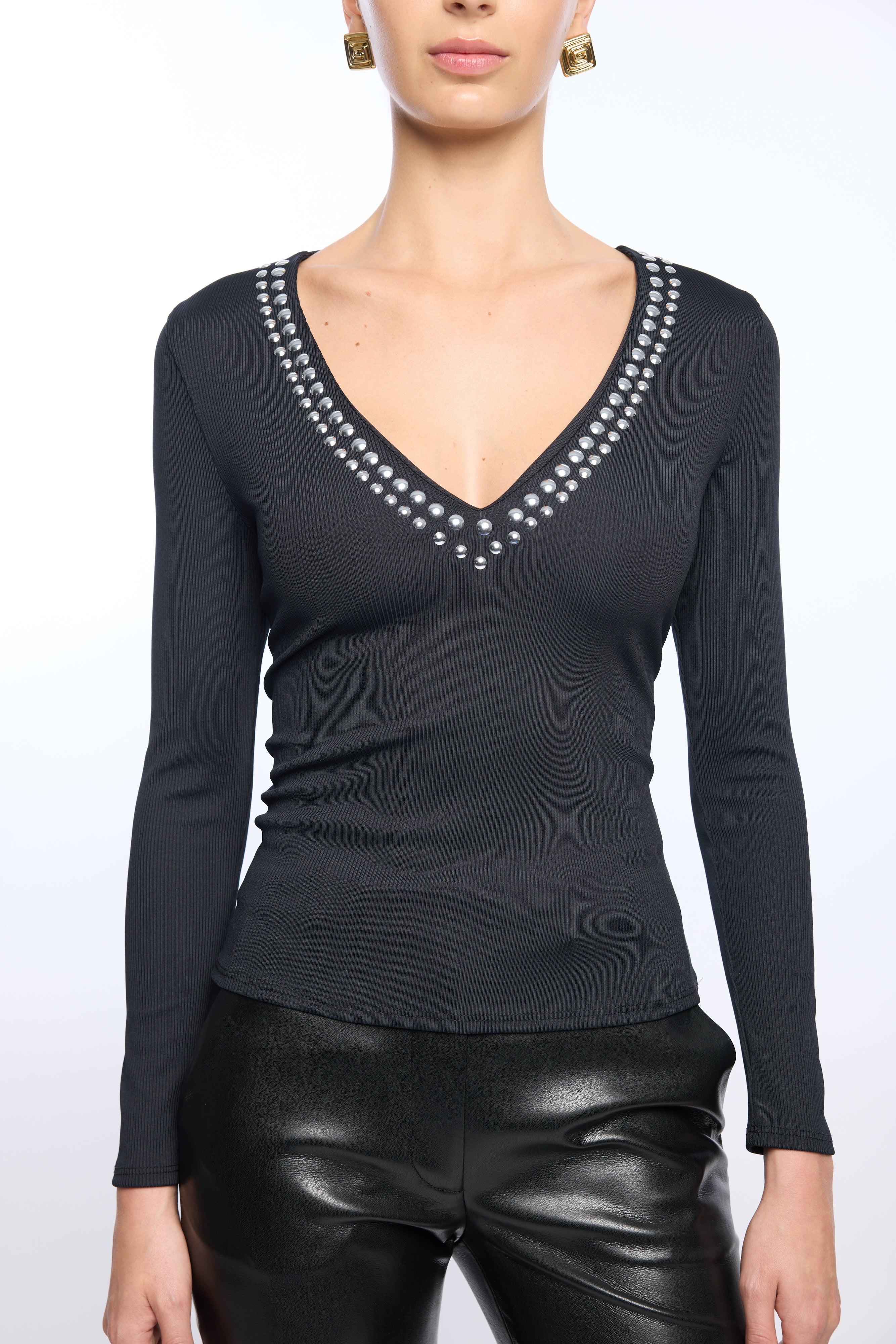 Shine from day to night in the Nolan Studded Top. Crafted from a soft ribbed knit, this fitted silhouette features a flattering V-neckline adorned with silver studs for just the right amount of edge. Effortlessly chic, it's perfect tucked into sleek trousers or paired with your favorite denim for a polished yet playful look. Made from a luxurious blend of 92% rayon and 8% elastane, this unlined slim-fit top delivers comfort and movement while maintaining its shape. Whether you're heading to the office or out for the evening, this versatile piece elevates any outfit with understated sophistication and contemporary style.