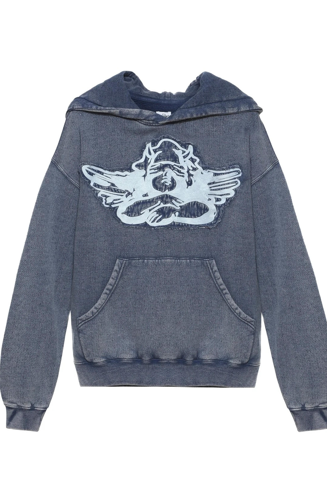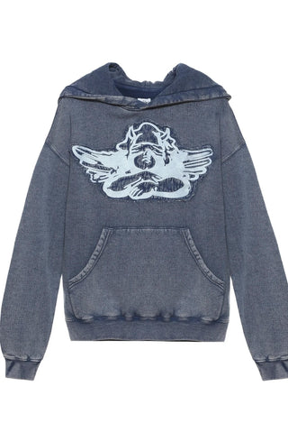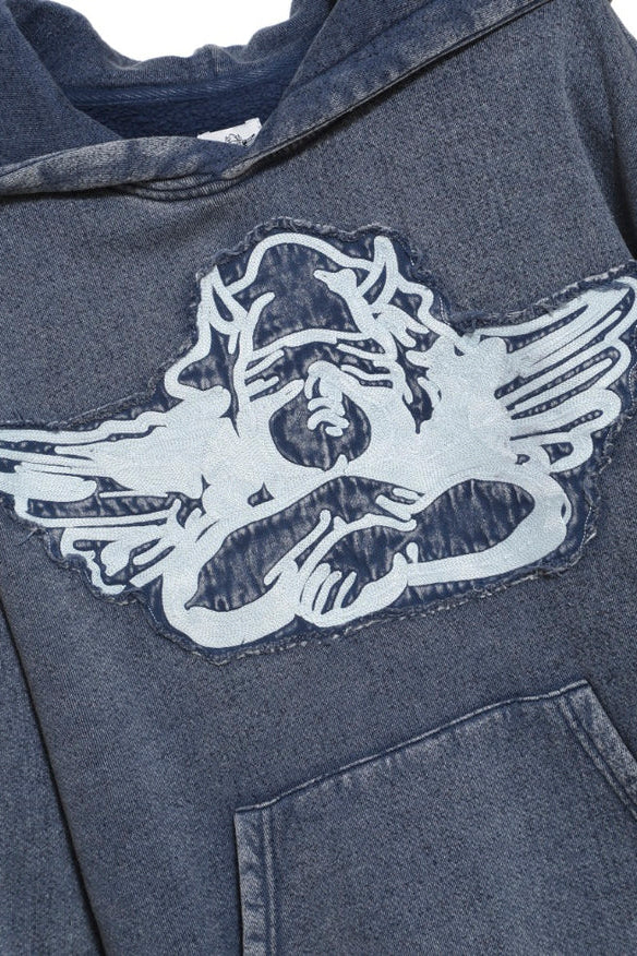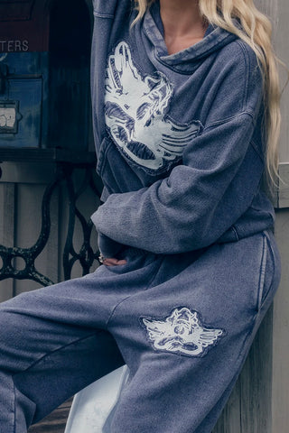 The Boys Lie Stitch Me Up Racer Hoodie combines vintage charm with modern street style. Its standout feature is a large blue-stitched cherub embroidered on the front, surrounded by distressed edges for a cool, worn-in look. Made from soft denim-washed fabric, this hoodie offers both comfort and edgy appeal, perfect for everyday wear. Pair it with the matching Kimmy Sweatpants to complete a stylish, coordinated outfit.