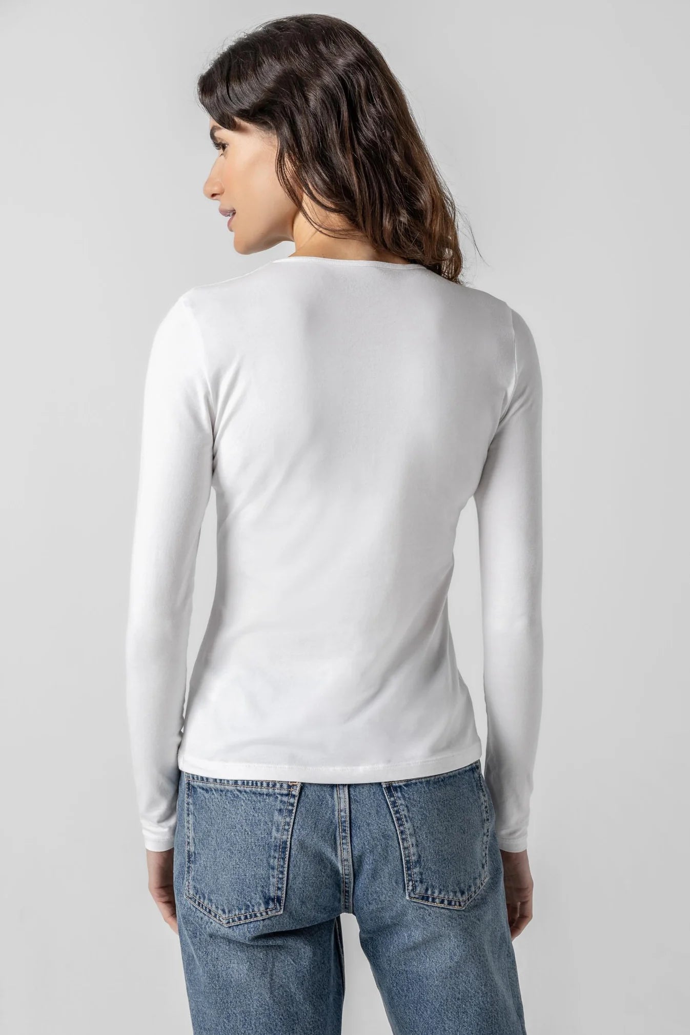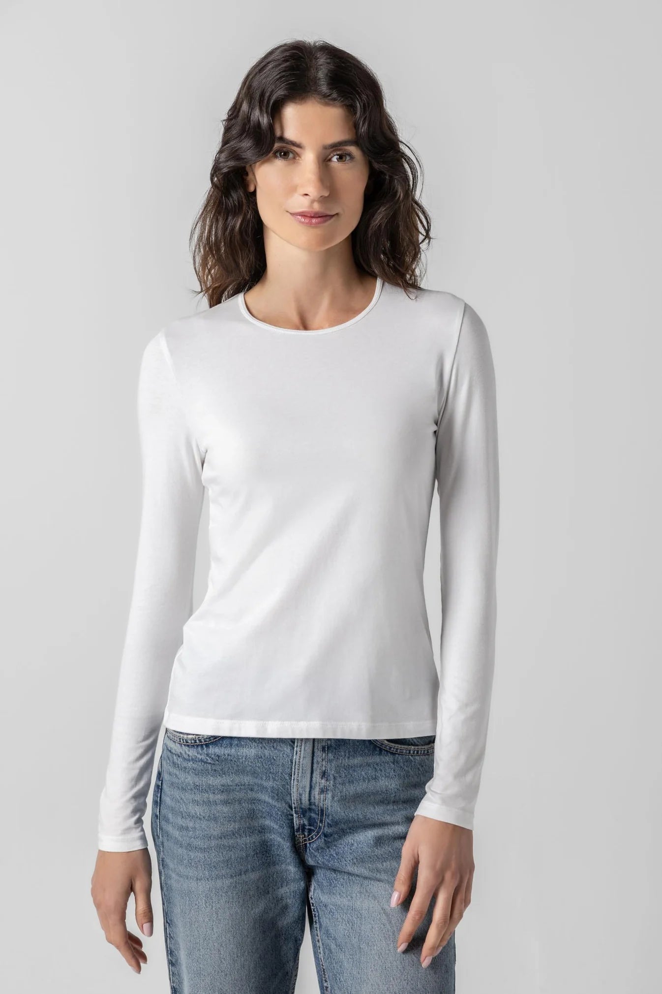 Elevate your wardrobe with our reimagined Lilla P Long Sleeve Crew Top. Crafted from luxurious 95% Pima Modal and 5% Spandex, this essential layering piece offers unparalleled comfort with just the right amount of stretch. The narrow trims create a sleek silhouette that pairs effortlessly under any outfit. Experience the perfect blend of softness and flexibility in this versatile staple that transitions seamlessly from season to season.