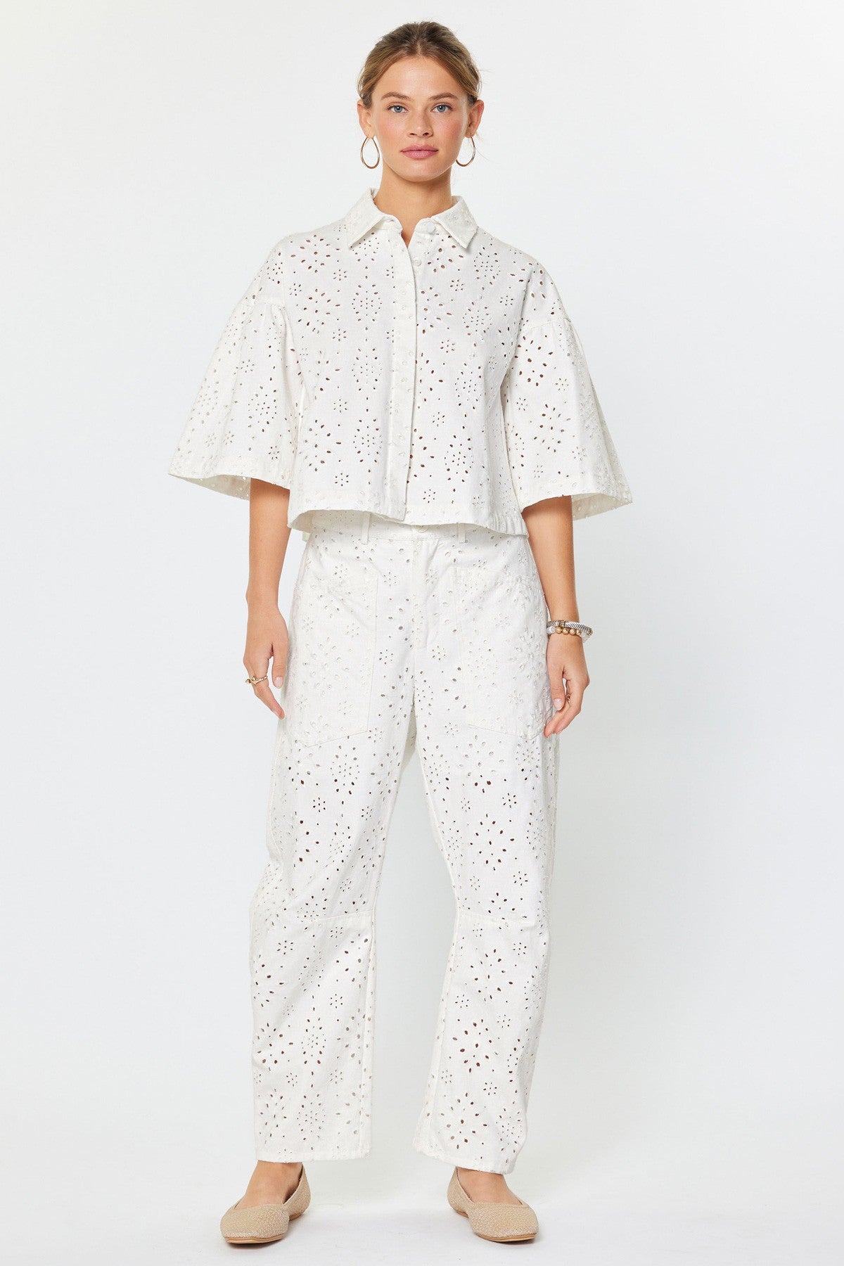 Effortless elegance meets everyday comfort in the Madison Eyelet Embroidered Cropped Shirt. Crafted from breathable cotton, this piece features delicate eyelet embroidery that adds refined texture and visual interest. The cropped boxy silhouette pairs perfectly with high-waisted bottoms, while short wide sleeves and a classic collar create a polished, versatile look. Button-down closure allows for easy layering and styling flexibility. Whether dressed up for brunch or down for casual weekends, this oversized relaxed-fit essential transitions seamlessly across your wardrobe.