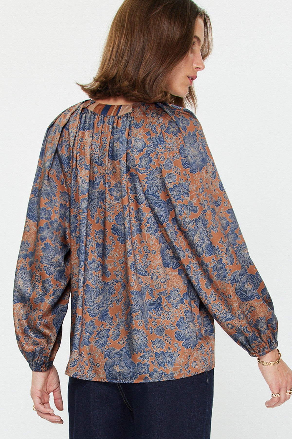 Elevate your wardrobe with the Madison Split Neck Floral Blouse, featuring a flattering split neckline and delicate pleated details that add refined texture. Its rich navy and rust floral print brings warmth and sophistication, perfect for both office days and weekend outings. Crafted for comfort and style, this blouse effortlessly blends classic charm with modern elegance.