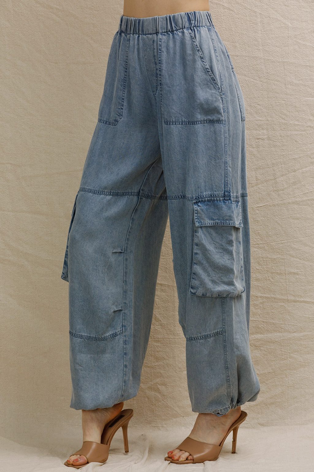 Crafted from breathable Tencel fabric, these cargo pants deliver comfort without compromise. The elastic waistband ensures a secure, flattering fit throughout the day, while adjustable ankle cuffs let you customize the silhouette to your style. Functional cargo pockets provide practical storage, making these pants perfect for work, weekend adventures, or everyday wear. Durable construction means they'll keep looking sharp season after season.