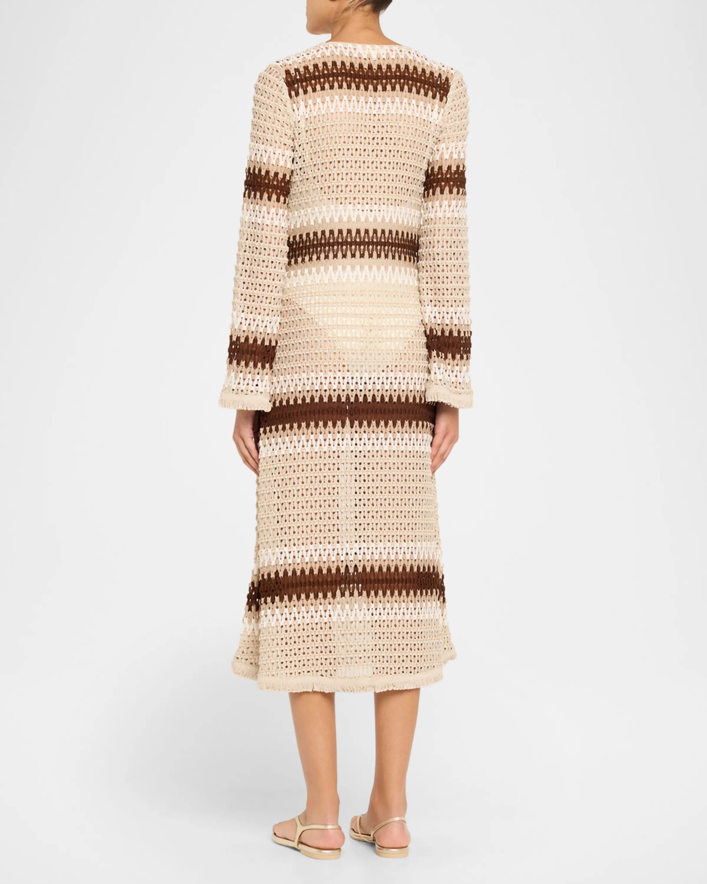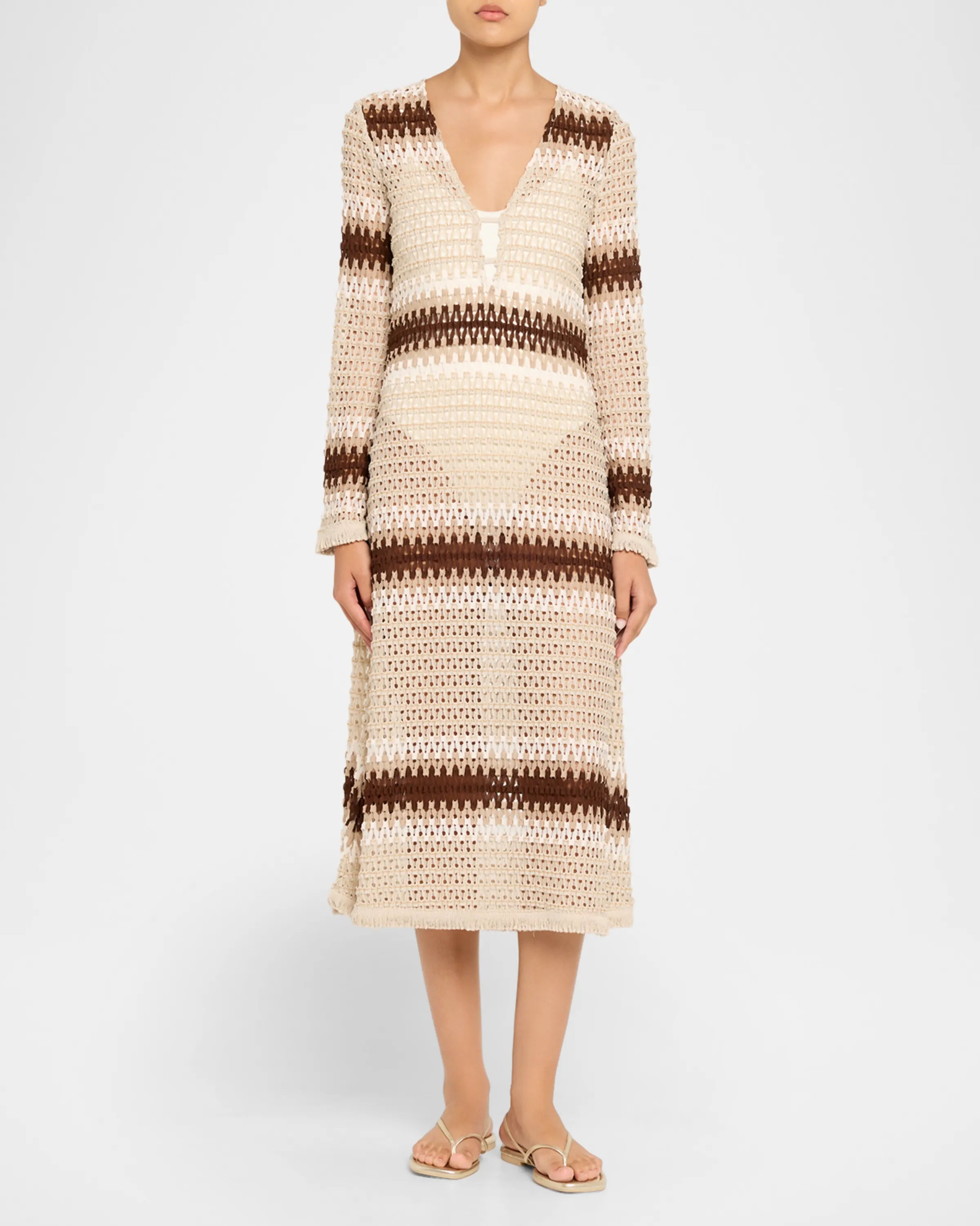 The Hannah makes a bold statement with its intricate all-over crochet detailing and sophisticated V-neck design. Long sleeves and a flattering A-line silhouette deliver timeless elegance, while the open weave construction makes it ideal for layering over your favorite bikini. Whether you're heading to a tropical escape or a casual beach gathering, this piece effortlessly transitions from day to evening wear. The breathable crochet fabric keeps you cool while the refined silhouette ensures you'll look polished and put-together. Perfect for those who want to elevate their resort wardrobe with understated luxury.