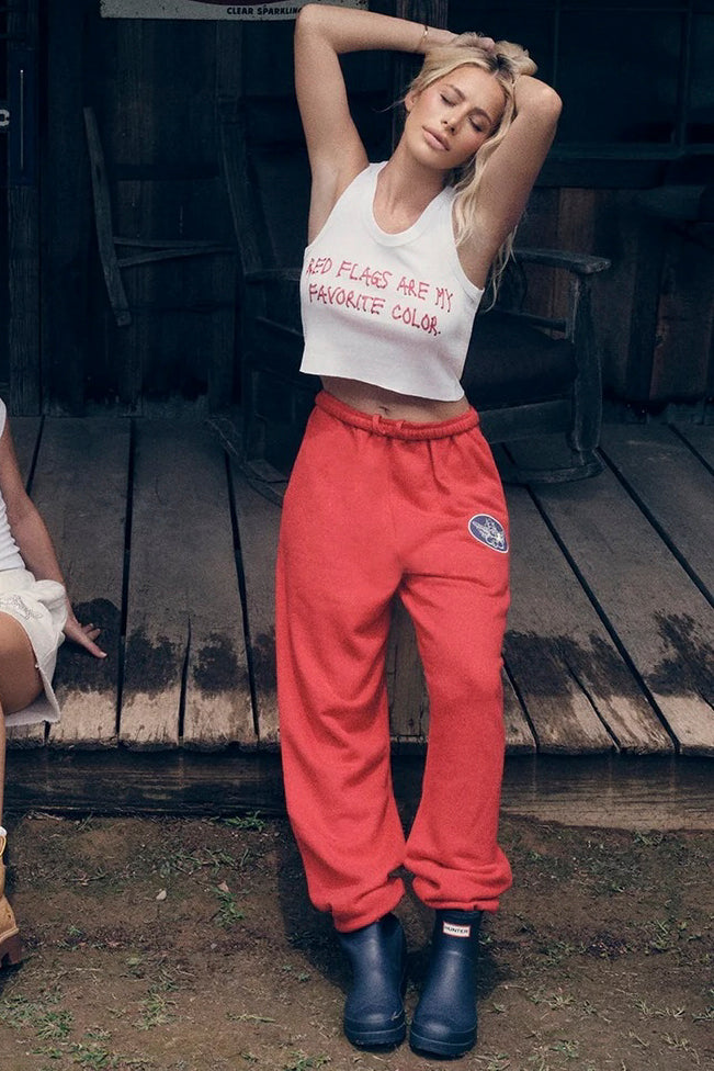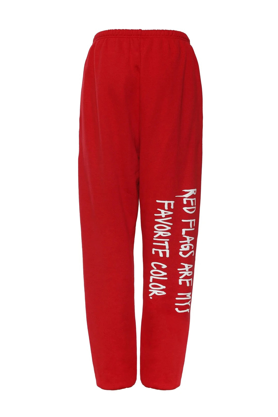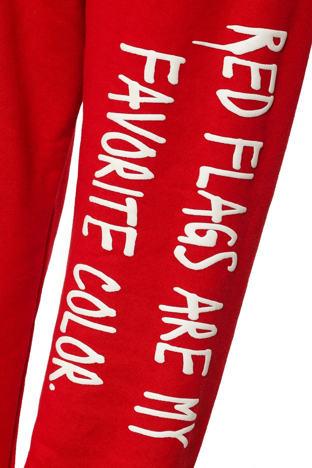 These bold red sweatpants make a statement with a small navy cherub patch on the front and the phrase "Red Flags Are My Favorite Color" printed down the back leg. Designed for comfort and style, they let you stand out while staying cozy. Pair them with the matching Harley Hoodie for a complete, edgy look that turns heads wherever you go.