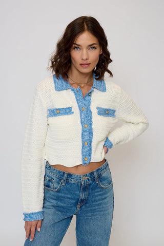 Experience comfort and style with the CPW Rose Scallop Edge Cardigan. Crafted from a soft textured knit, it features a unique contrasting trim that highlights its scalloped edges. The button-down front and patch pockets with fringe detail add charming accents, while the cropped length offers a modern silhouette perfect for layering. Easily pair it with your favorite basics for a look that’s effortlessly casual or polished. This cardigan is your go-to piece for versatile, cozy elegance.
