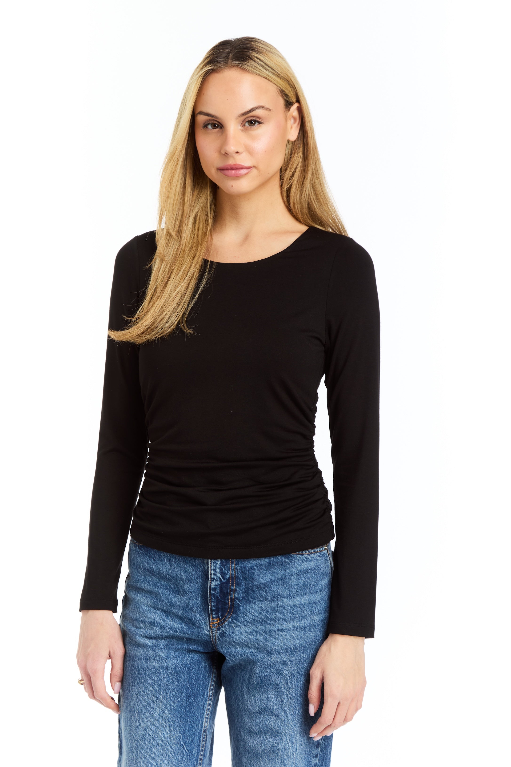 Elevate your wardrobe with the Drew Pansy Shirt, a long sleeve essential designed for style and comfort. Featuring subtle ruching on the sides, this shirt offers a flattering silhouette that enhances your natural shape. Perfect for layering or wearing solo, its versatile design seamlessly transitions from day to night. Experience a blend of effortless elegance and everyday wearability with this must-have basic.