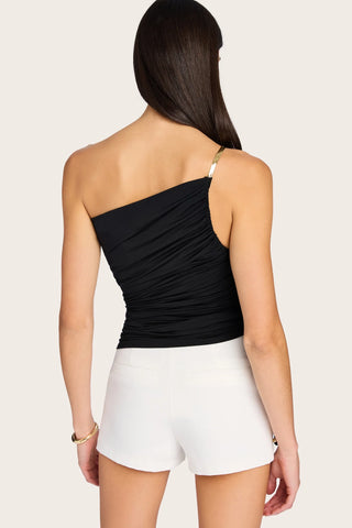 Elevate your style with the Generation Love Rinna Top, featuring a sleek ruched jersey design and an edgy chain shoulder strap. The unique string tie adds a bold finishing touch, making this top perfect for turning heads. Pair it effortlessly with pants or skirts for a confident, statement-making look.