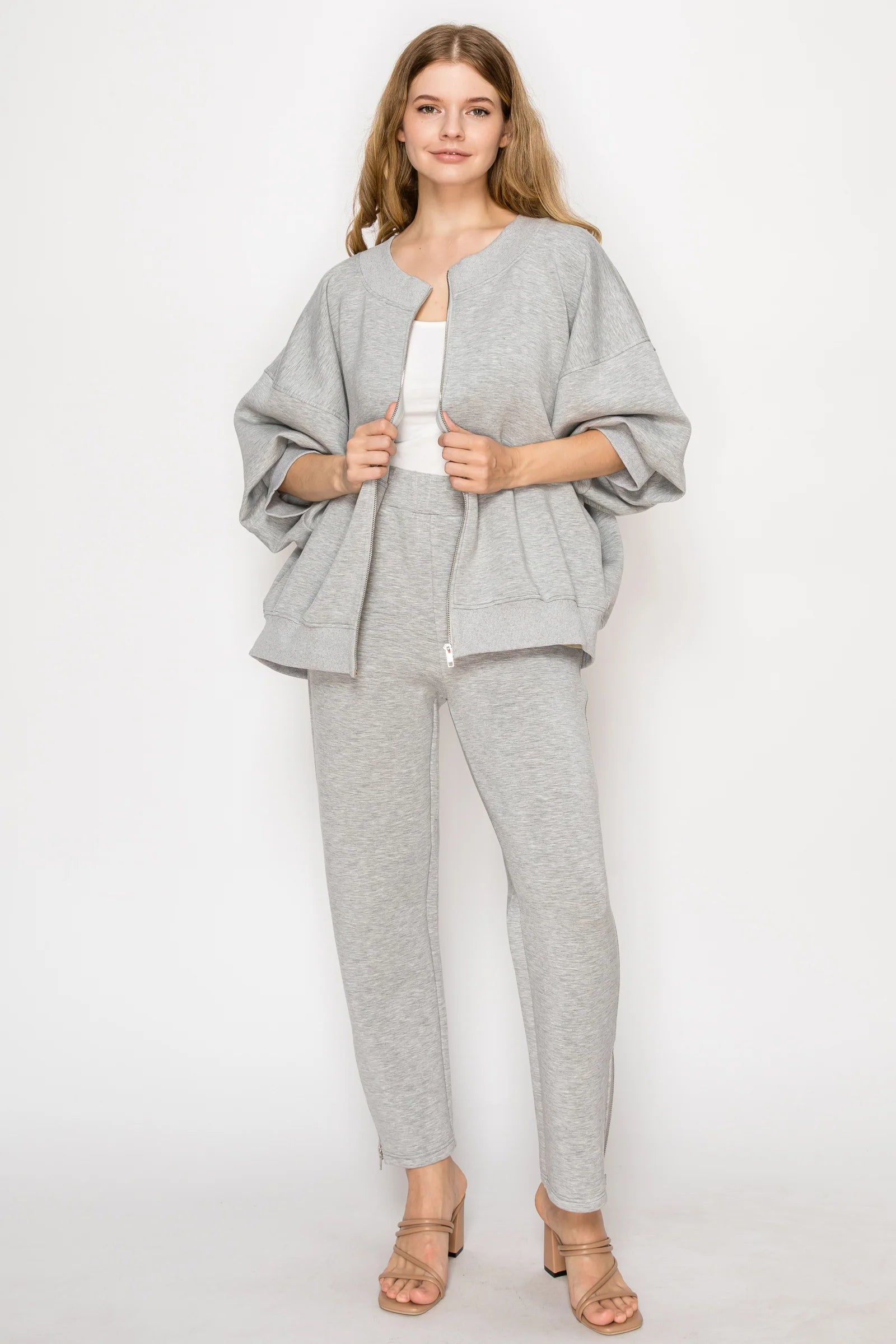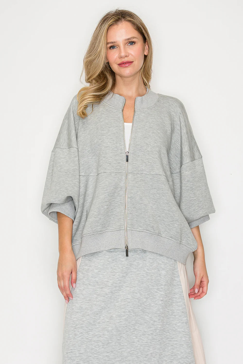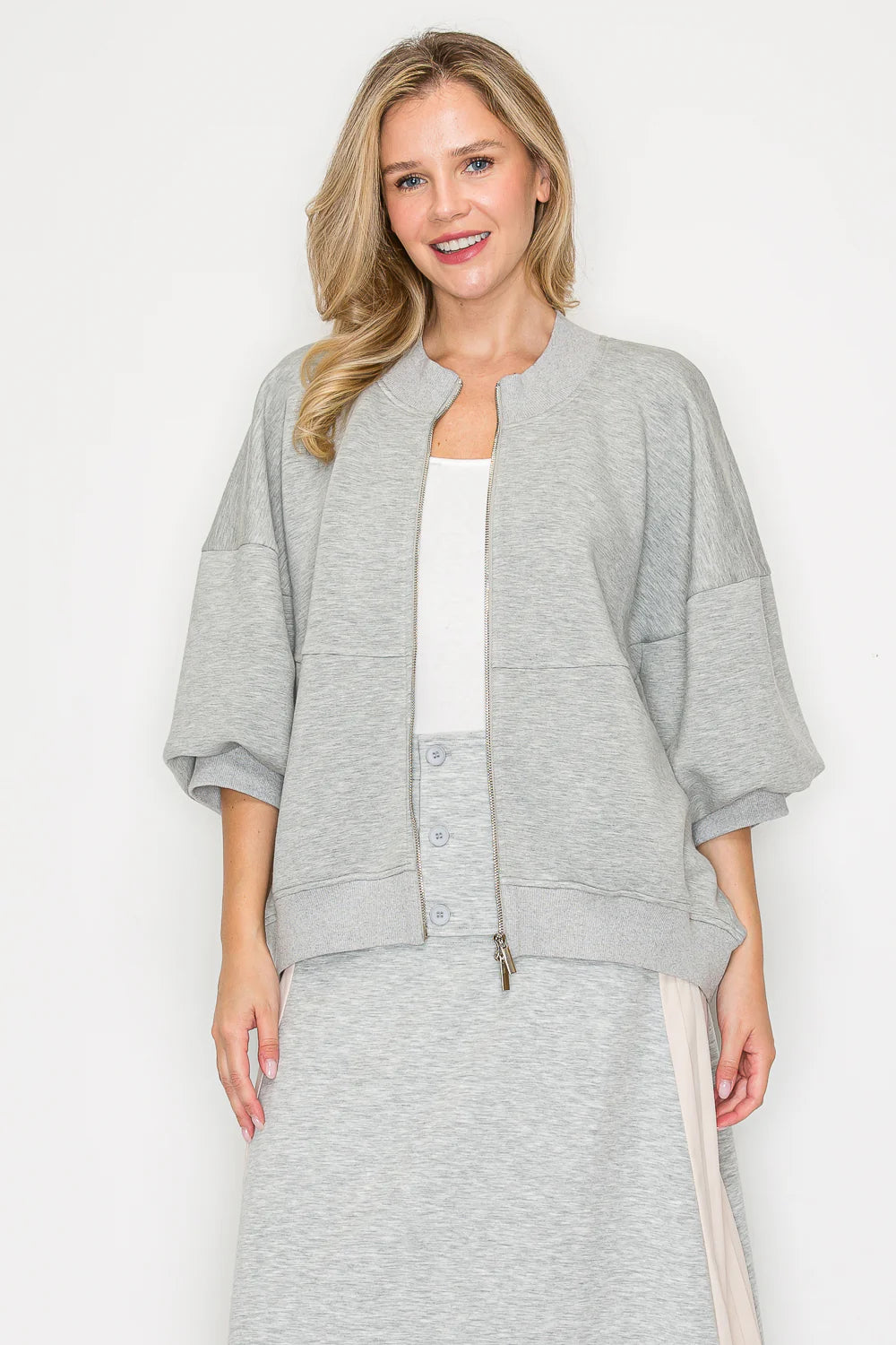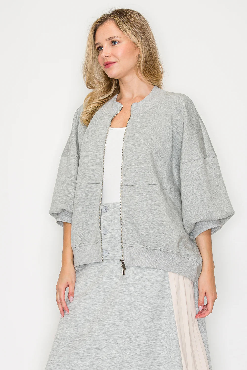 Experience the perfect blend of style and comfort with the Joh Finella Stretch Scuba Jacket. Crafted from premium French stretch scuba fabric, this jacket offers a smooth, flexible fit that moves with you. Its half balloon sleeves with cuffs and round neck add a sophisticated touch, while the zip-up front ensures easy wear. Designed for a relaxed yet polished look, it pairs effortlessly with the matching Fernanda Pant for a complete, chic outfit. Elevate your wardrobe with this versatile jacket that combines elegance and ease.