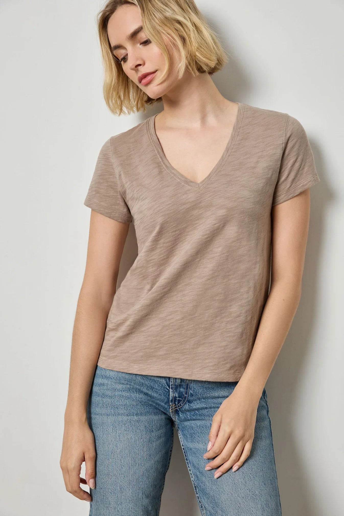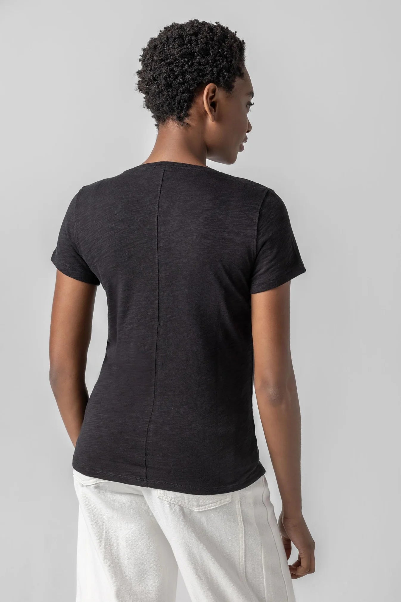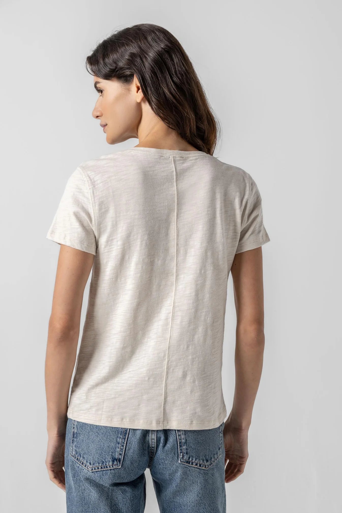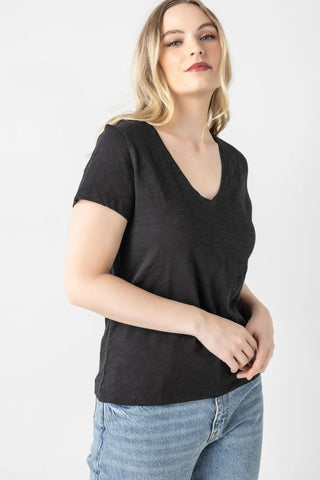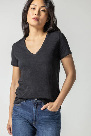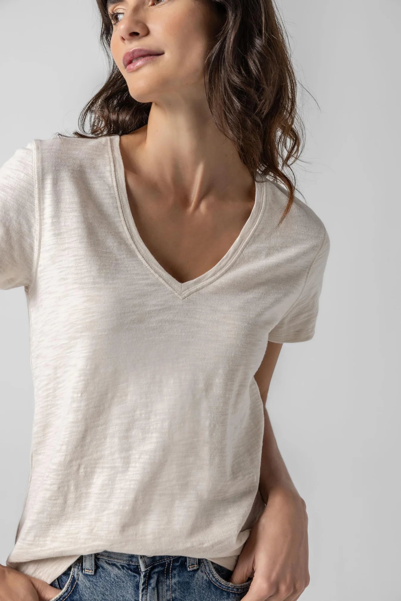 Elevate your everyday style with our Lilla P Back Seam V Neck Tee. Crafted from premium 100% cotton loose knit slub, this mid-weight tee combines comfort with sophistication. The flattering V-neckline and signature back seam detail create a distinctively feminine silhouette that skims your body perfectly. With short sleeves that fit close to the shoulder cap, this versatile essential offers just the right coverage while maintaining an elegant look. A best-seller that returns in fresh colors each season, this timeless tee will quickly become the foundation of your wardrobe.
