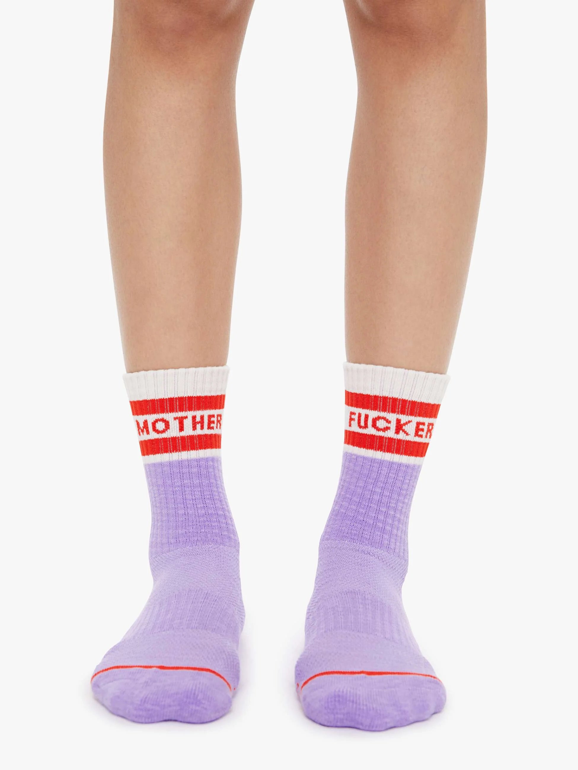 Take a confident stride in these classic tube socks from MOTHER, featuring a bold "Watch your step" message that makes a statement. The lavender and white colorway is elevated by striking red lettering and accents, creating an eye-catching design that stands out from everyday basics. Perfect for anyone who wants their socks to reflect their personality, these versatile tubes pair effortlessly with sneakers, loafers, or casual footwear. Comfort meets attitude in every step you take.