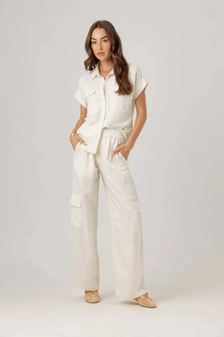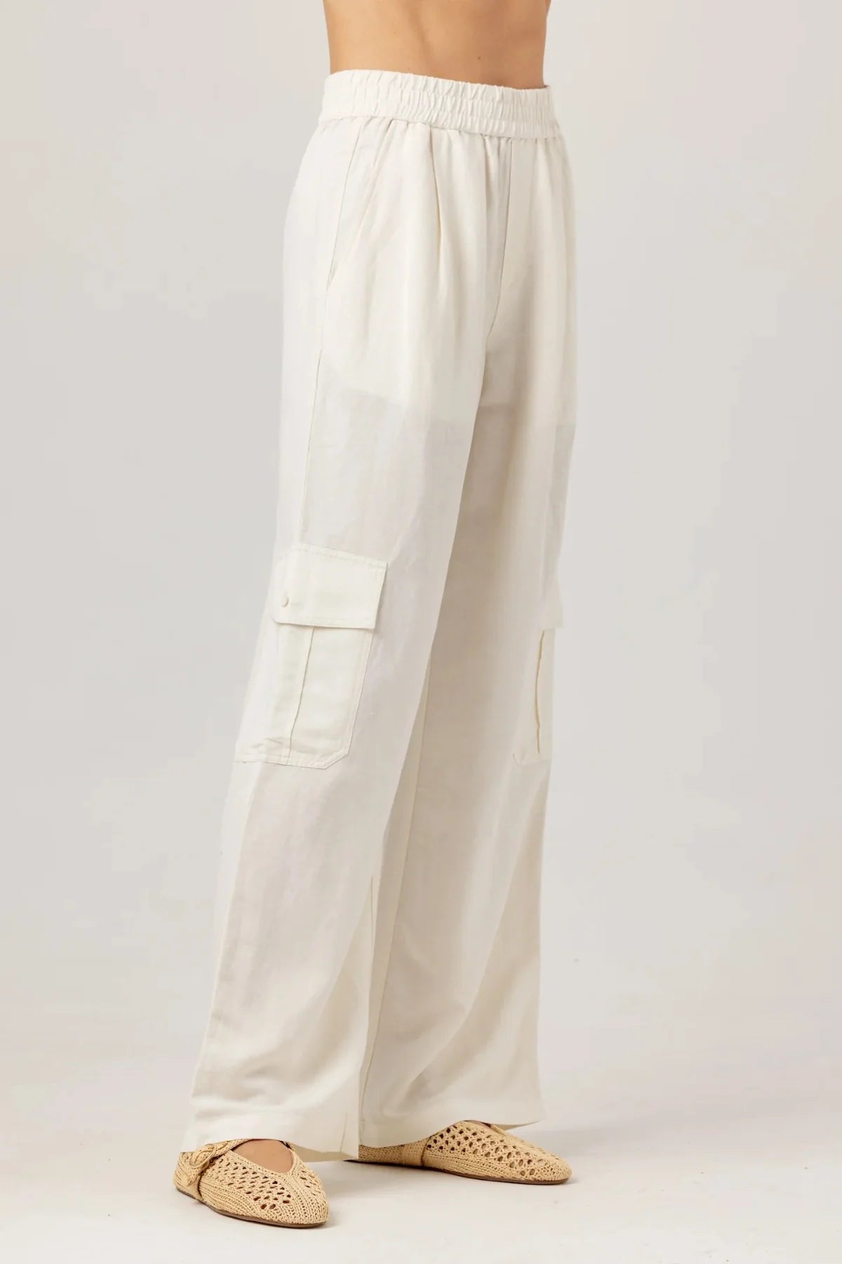 The Sundays Sabine Cargo Pants offer a fresh take on the classic cargo style with a lightweight linen blend that keeps you cool and comfortable. Designed with a relaxed, slightly slouchy fit and an elastic waistband, these full-length pants provide effortless ease and flattering movement. Practical pockets add a utilitarian touch, while the 32” inseam ensures a casual yet polished look.