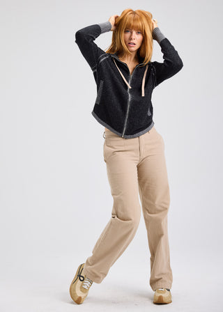 Stay stylish and comfortable with the Zaket & Plover Two Tone Zip Up. Featuring a sleek black design accented with subtle grey details, this zip-up offers practical pockets and a trendy tie neck for added flair. Ribbed cuffs ensure a snug fit, making it perfect for layering on cooler days. Elevate your casual wardrobe with this versatile and effortlessly chic piece.