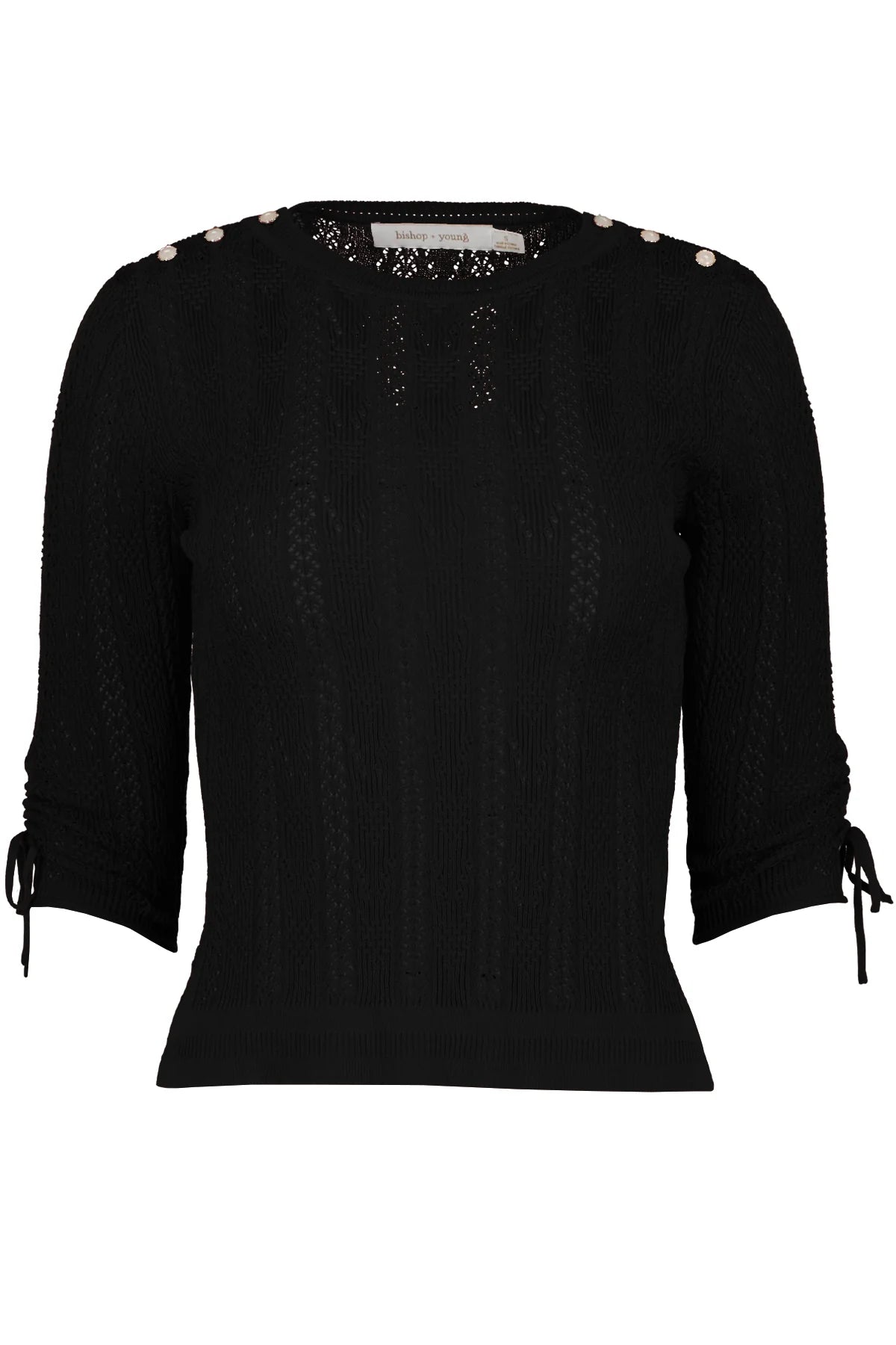 The Bishop & Young Money Sweater features a flattering scoop neckline and delicate button detailing at the shoulders, adding a touch of elegance. Its 3/4 sleeves are finished with adjustable ties, allowing you to customize your look with ease. This sweater effortlessly combines style and comfort for any occasion.