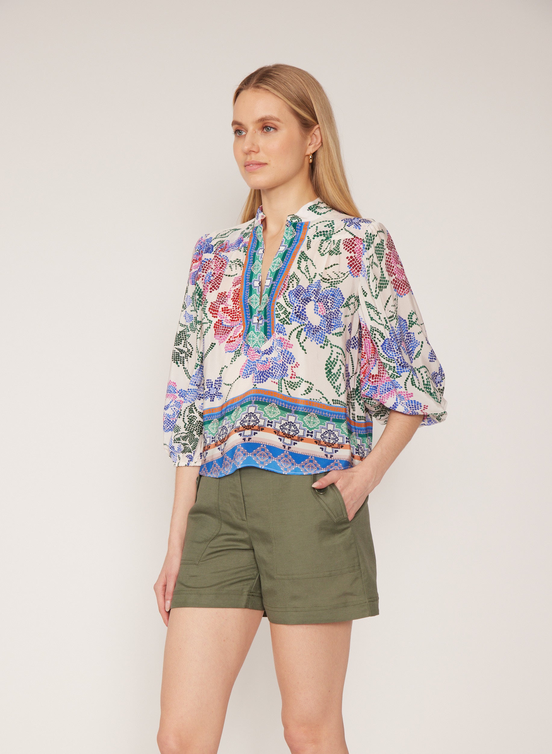 Elevate your wardrobe with our stunning Gilner Farrar Bethany Empress Blouse. This sophisticated piece features an eye-catching empress print, elegant 3/4 sleeves, and a refined banded collar that frames your face beautifully. Perfect for transitioning from office to evening events, this versatile blouse combines timeless style with contemporary flair for a look that commands attention.