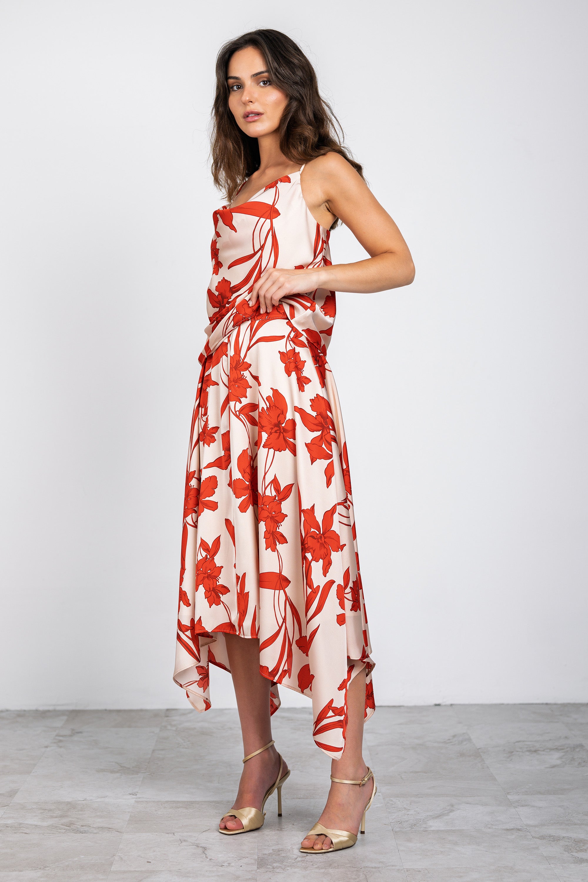 The Samantha Skirt brings effortless sophistication to your everyday rotation. This midi design features an asymmetric handkerchief hem that catches light with every step, crafted from luxurious French printed Charmeuse with a silky dull sateen finish. Fully lined for comfort and movement, it fastens with a discreet center back invisible zipper for a polished silhouette. The bold floral print transitions seamlessly from day to evening, while the fluid fabric drapes with refined elegance. Pair with the matching Valeria Cami to complete your look.