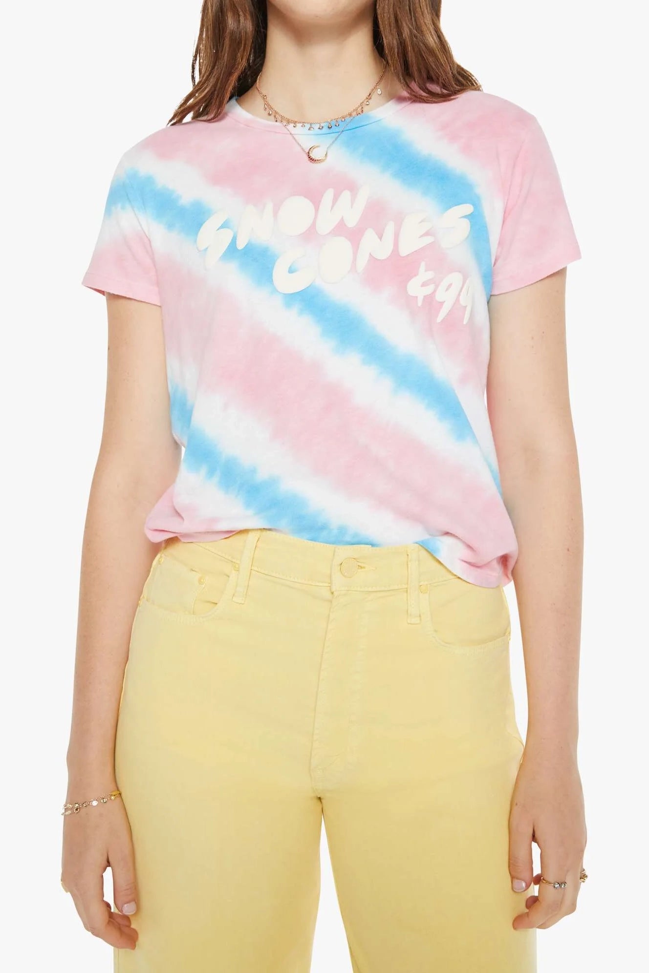 Stay cool and stylish with the Mother Lil Goodie Goodie Snowcone Tee. Made from a recycled cotton blend, this soft and slightly sheer crewneck features a slim fit for a vintage look and feel. The pastel tie-dye design and puff-painted text add a touch of playfulness to this must-have shirt.