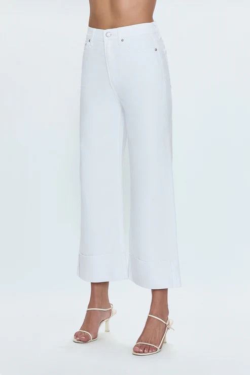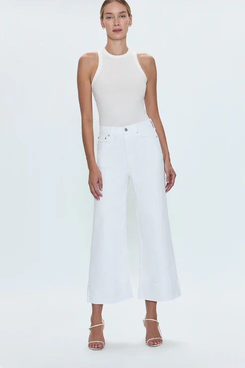 Elevate your denim game with our Pistola Lana Cropped Wide Leg Jeans. The relaxed, ultra wide leg silhouette is crafted from our signature comfort stretch denim, providing a structured shape with the perfect amount of stretch. With a raw finished hem and wide stitched cuffs, these jeans are finished in a vivid white wash with metal hardware for a bold, statement-making look.