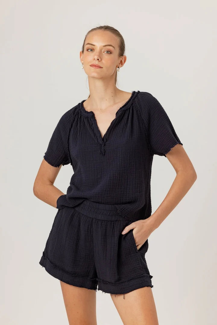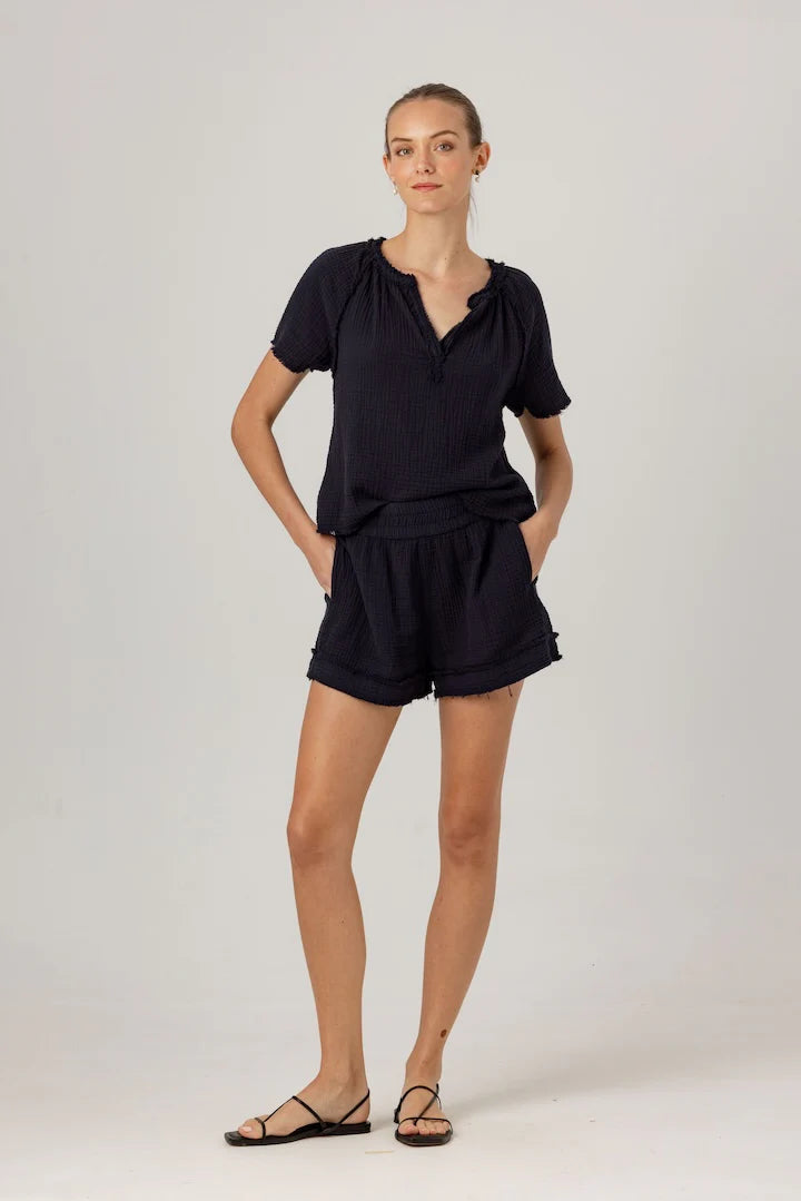 Elevate your summer wardrobe with our Sundays Gauze Fuller Shorts. These pull-on shorts combine effortless style with maximum comfort, featuring a forgiving elastic waistband and convenient side pockets. The short 2.25" inseam creates a flattering silhouette, while raw edge detailing adds that perfect casual touch. Complete the look with our Mirielle Top for an irresistible matching set that will become your go-to summer essential.