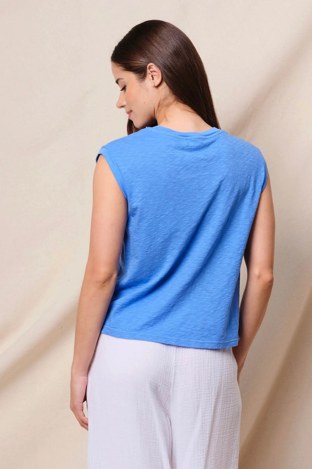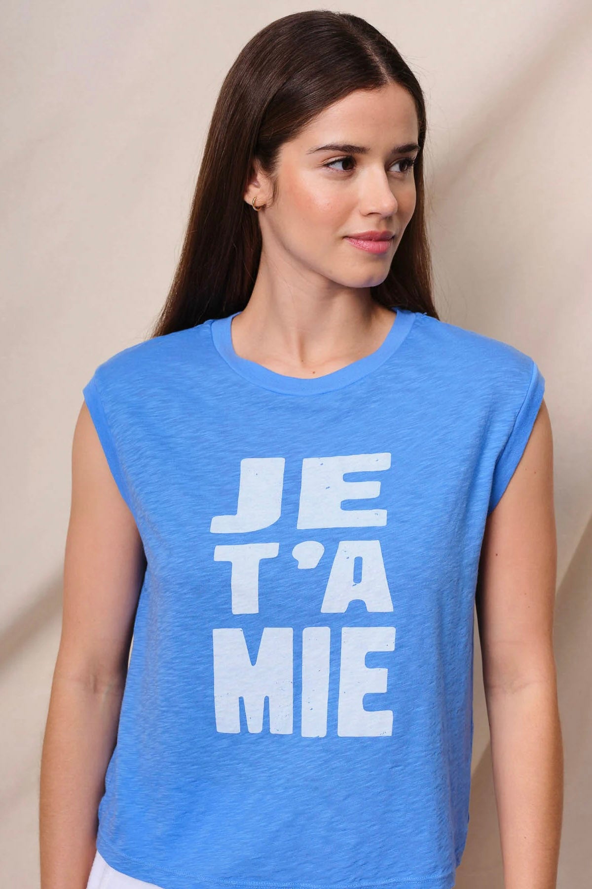 This Sundry Je T'Amie Cropped Muscle Tee combines comfort and style with its soft 100% cotton fabric and relaxed fit. The vibrant light blue "JE T'AIME" graphic on lagoon blue slub cotton adds a playful, romantic touch, while raw-edge sleeves enhance its casual, effortless look. Perfect for sunny days, this made-in-USA tee is an easy way to express your laid-back, confident vibe.