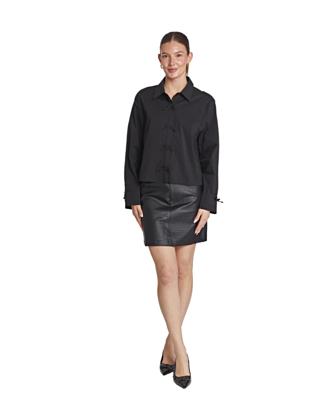 The Edith Top merges understated sophistication with unexpected femininity. This long-sleeve button-up blouse features a structured, slightly boxy silhouette that commands attention without demanding it. Delicate fabric-covered bows line the front placket, replacing conventional buttons with a refined flourish of personality. A sharp pointed collar grounds the design in timeless tailoring, while the overall composition strikes that rare balance between polished and playful. Perfect for those who appreciate garments that whisper rather than shout—a piece that elevates any wardrobe with quiet confidence and enduring style.